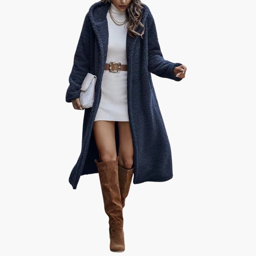 Long Teddy Plush Women's Coat with Hood and Button Closure