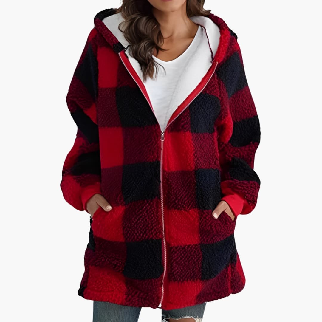 Women's Zip-Up Hooded Jacket with Plaid Pattern and Sherpa Lining