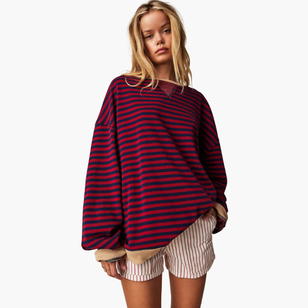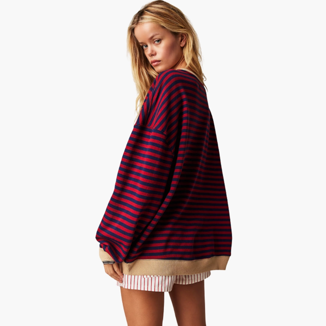 Pruhovaný dámský svetr s kontrastními detaily a volným střihem
