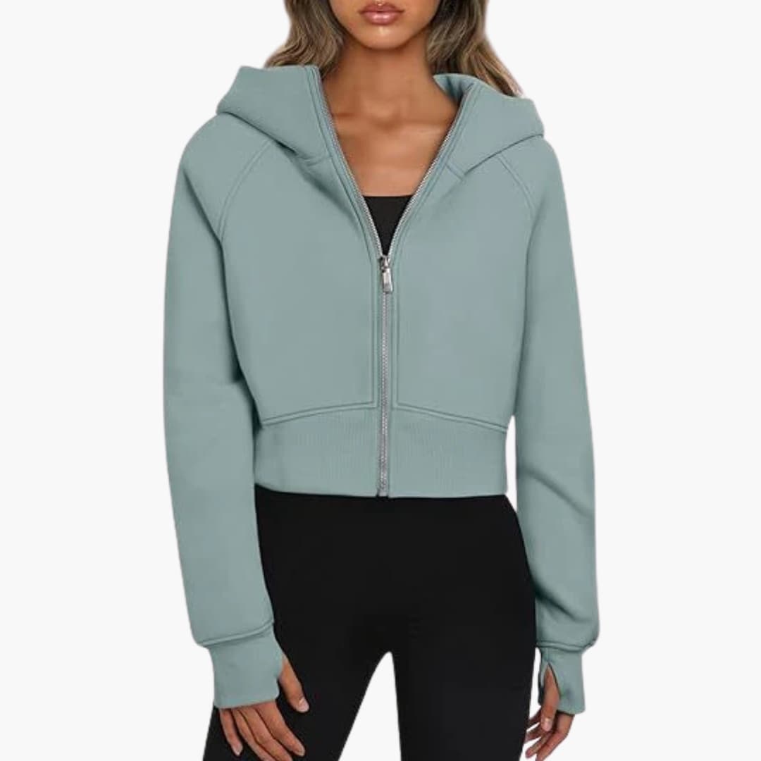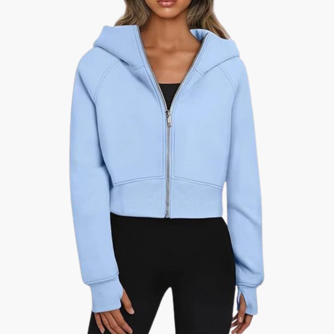 Krátká mikina s kapucí pro ženy se zipem a žebrovaným lemem