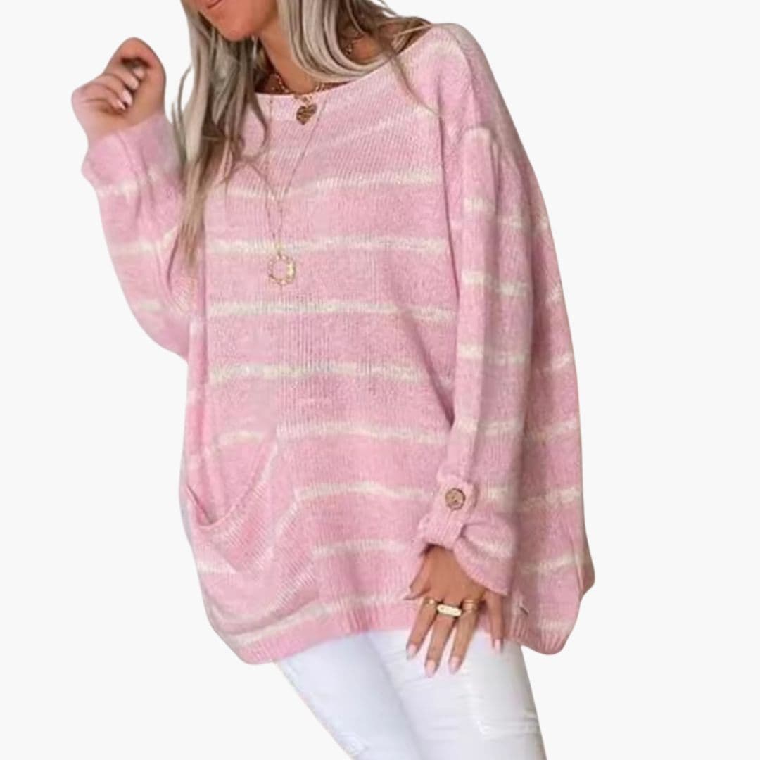 Pruhovaný dámský svetr s volným střihem, vhodný pro vrstvení přes různé topy. Tento model má výstřih ve tvaru lodi, střih na přetažení a pravidelný vzor horizontálních pruhů na těle i rukávech. Velká kapsa našitá vpředu v úrovni boků je určena pro nošení drobných předmětů. Dlouhé rukávy jsou zakončeny knoflíkem na zápěstí. Rovný střih nabízí širokou siluetu, vhodnou pro všechna roční období.