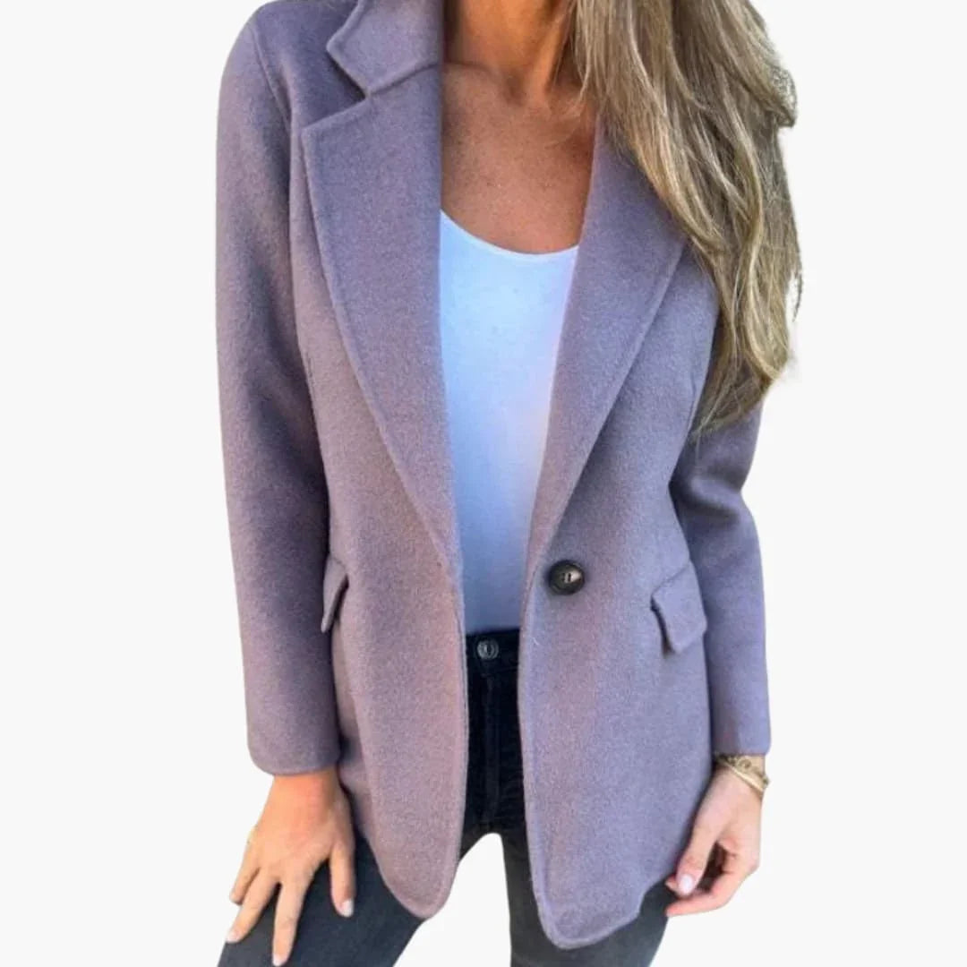 Tato dámská blejzrová bunda má klopový límec a zapínání na jeden knoflík vpředu. Má dlouhé rukávy s přímým střihem a dvě boční vsazené kapsy. Model má okraj délky ke kyčlím a hladký povrch látky, což z ní činí univerzální volbu pro vrstvení přes různé outfity.