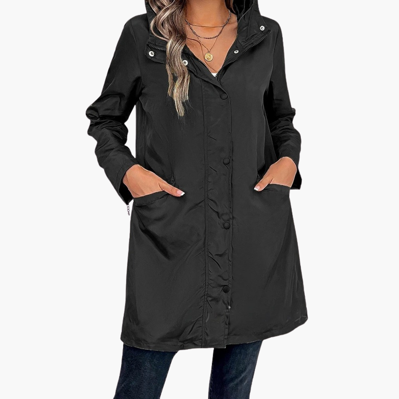 Diese Damenjacke verfügt über einen durchgehenden Knopfverschluss, lange Ärmel und eine Kapuze für besseren Schutz. Sie ist mit zwei praktischen Fronttaschen ausgestattet und perfekt für Tage in der Zwischensaison. Ihr verlängerter Schnitt ermöglicht das Tragen zu verschiedenen Outfits.