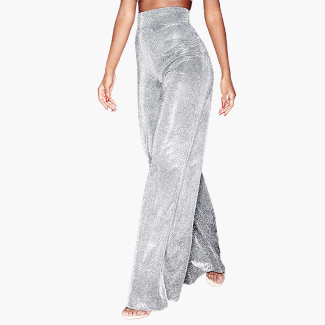 Γυναικεία παντελόνια ψηλόμεσα με φαρδιά μπατζάκια και επιφάνεια με παγιέτες