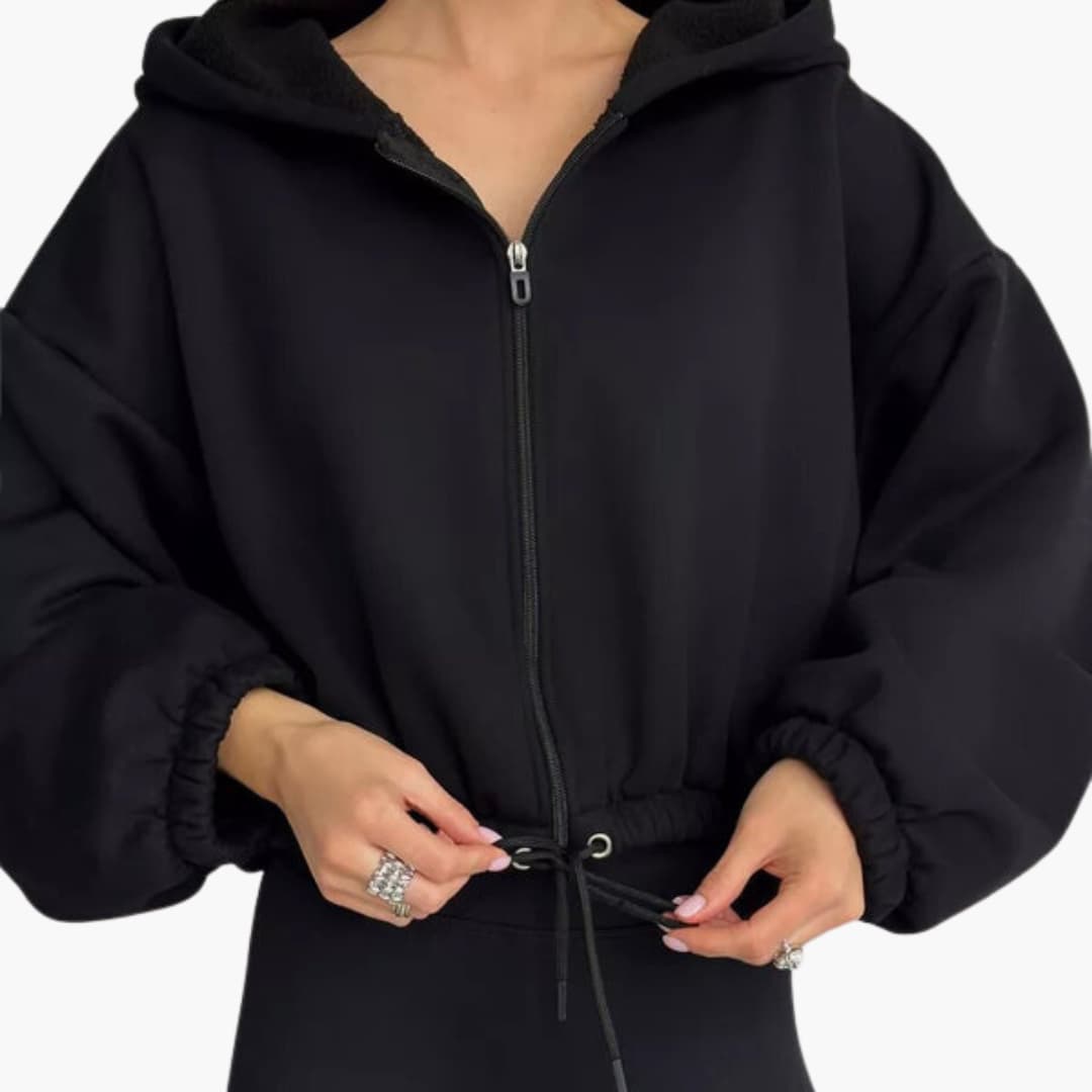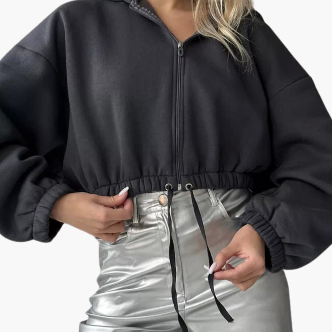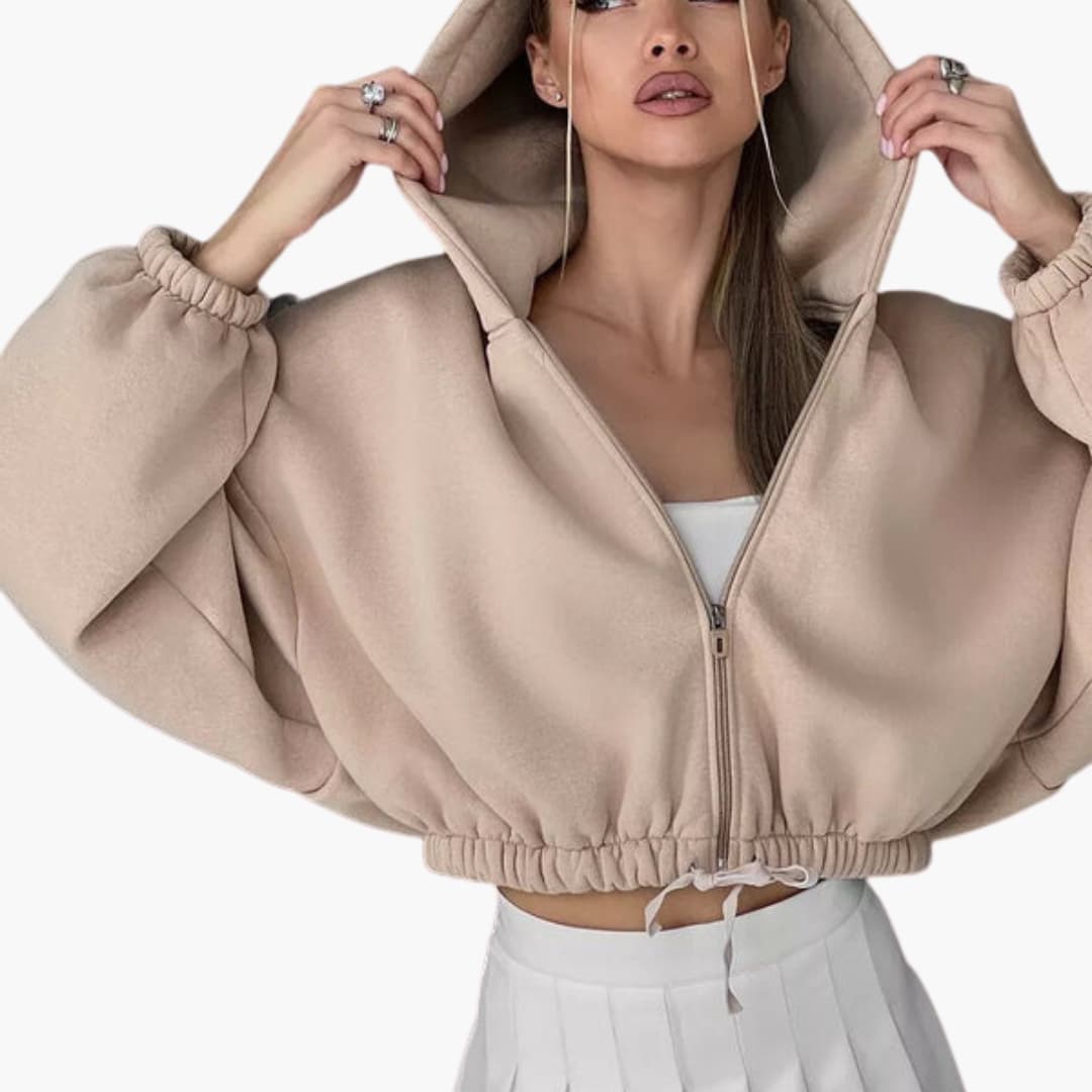 Γυναικείο κοντό φούτερ με κουκούλα, κλείσιμο με φερμουάρ και κορδόνι
