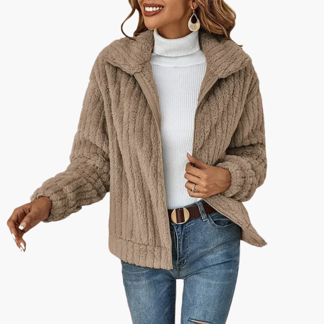 Γυναικείο μπουφάν στυλ Teddy με φερμουάρ και φαρδύ γιακά