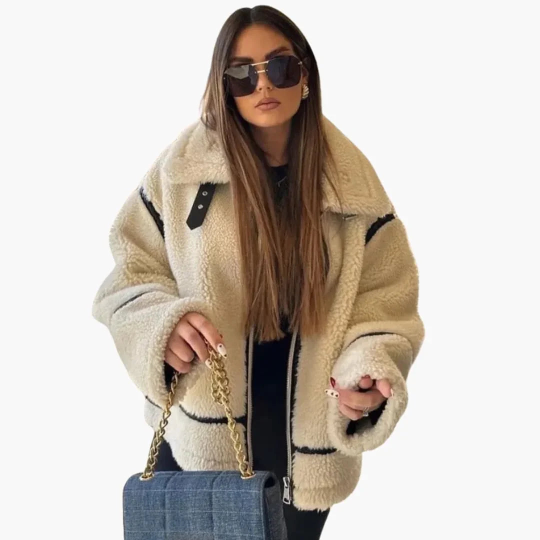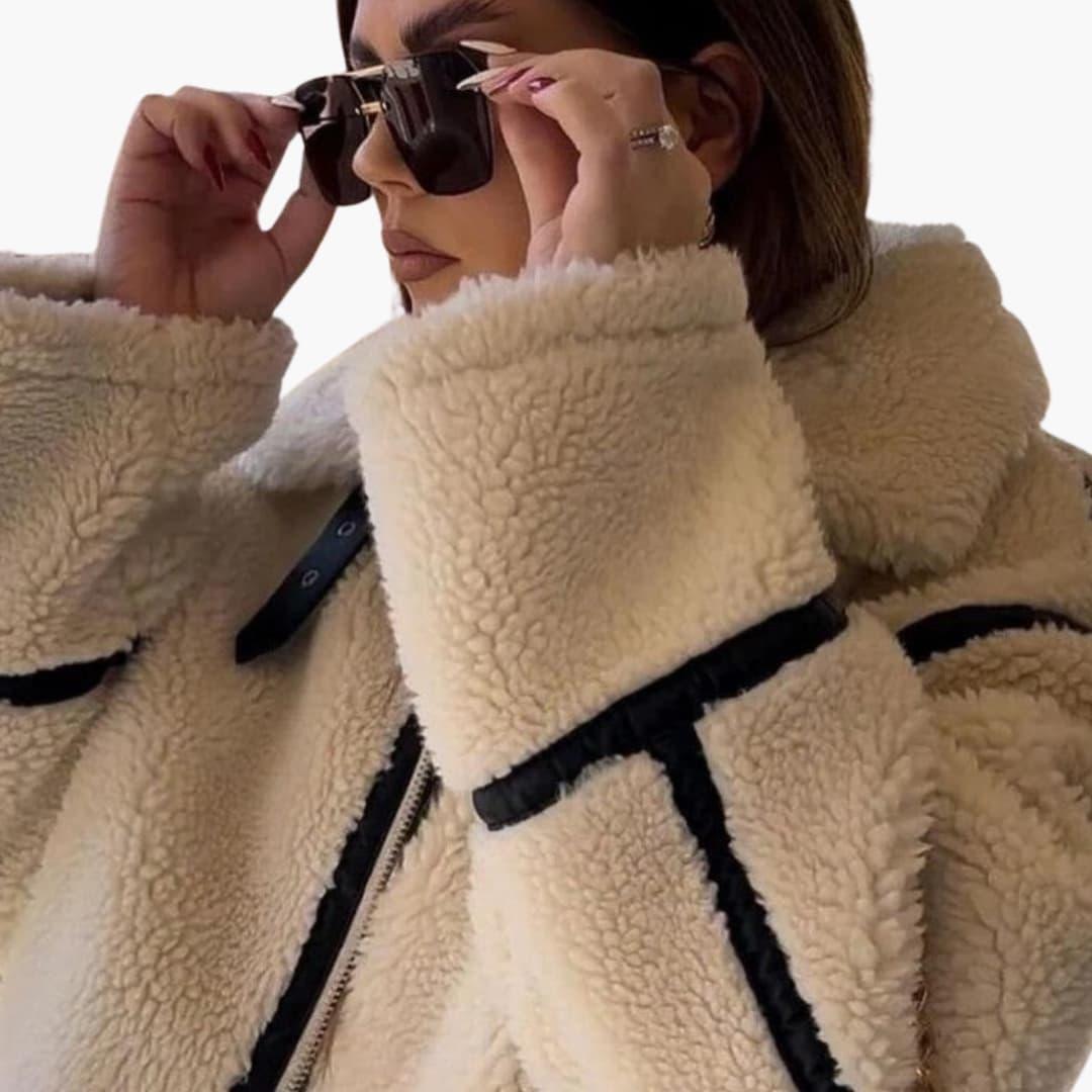 Γυναικείο teddy μπουφάν με φερμουάρ και αντιθετικές λεπτομέρειες