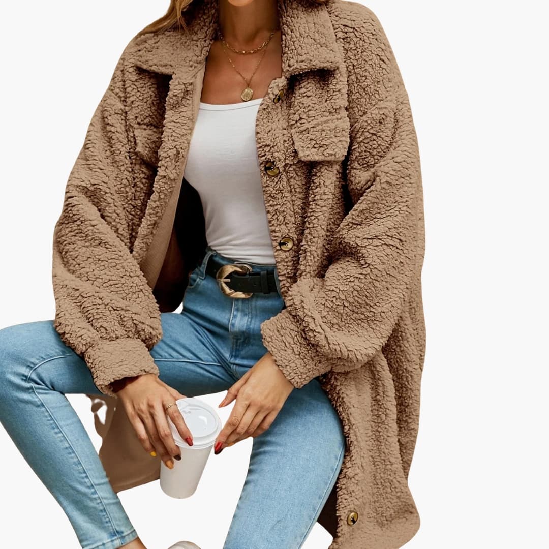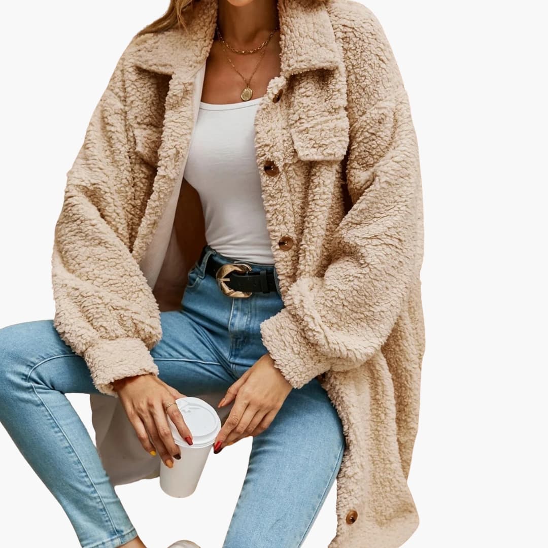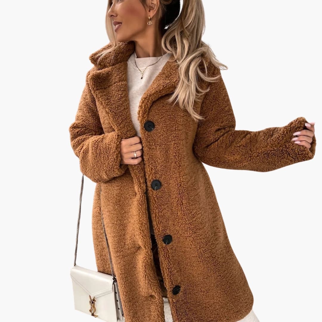 Γυναικείο μακρύ παλτό Teddy από βελούδο με φαρδύ γιακά