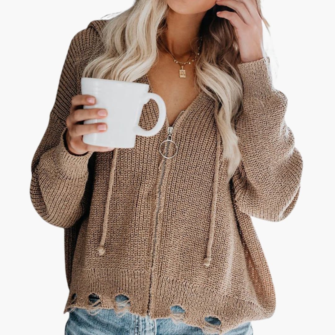 Γυναικείο ελαφρύ πλεκτό μπουφάν με κουκούλα και εμπρόσθιο φερμουάρ