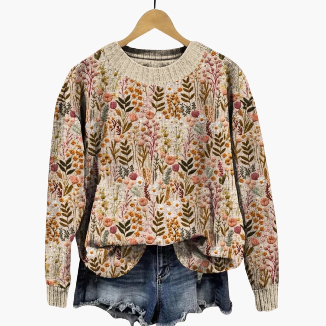Γυναικείο Πλεκτό Πουλόβερ με Λουλουδάτο Σχέδιο και Στρογγυλή Λαιμόκοψη