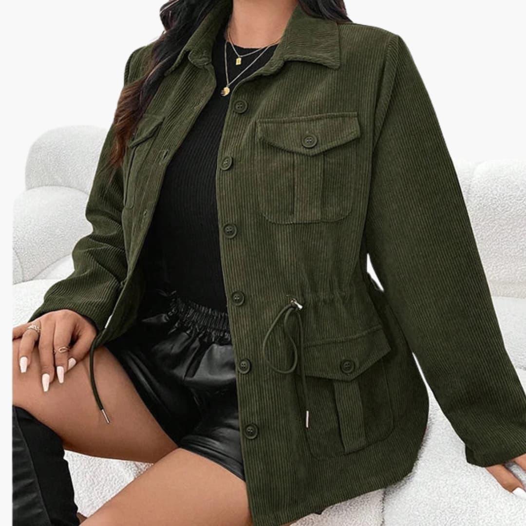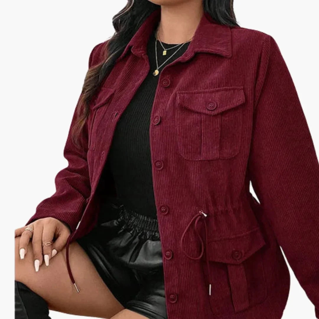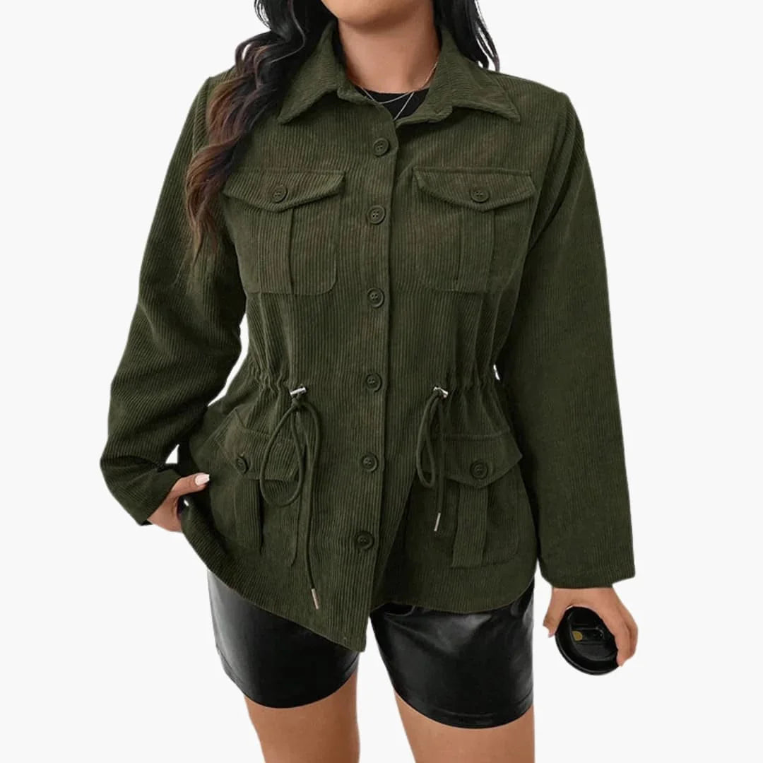 Αυτό το γυναικείο μπουφάν από κορδόνι διαθέτει κλασικό γιακά με κλείσιμο με κουμπιά μπροστά και μακριά μανίκια. Είναι εξοπλισμένο με τσέπες στο στήθος με καπάκι και κάτω τσέπες με ραφή. Η μέση περιλαμβάνει ρυθμιζόμενο κορδόνι για εφαρμογή κατά παραγγελία. Ένα ίσιο τελείωμα και η επιφάνεια από κορδόνι ολοκληρώνουν την εμφάνιση.
