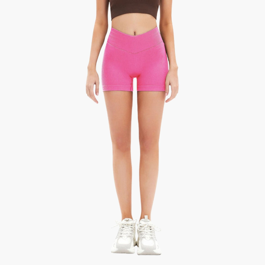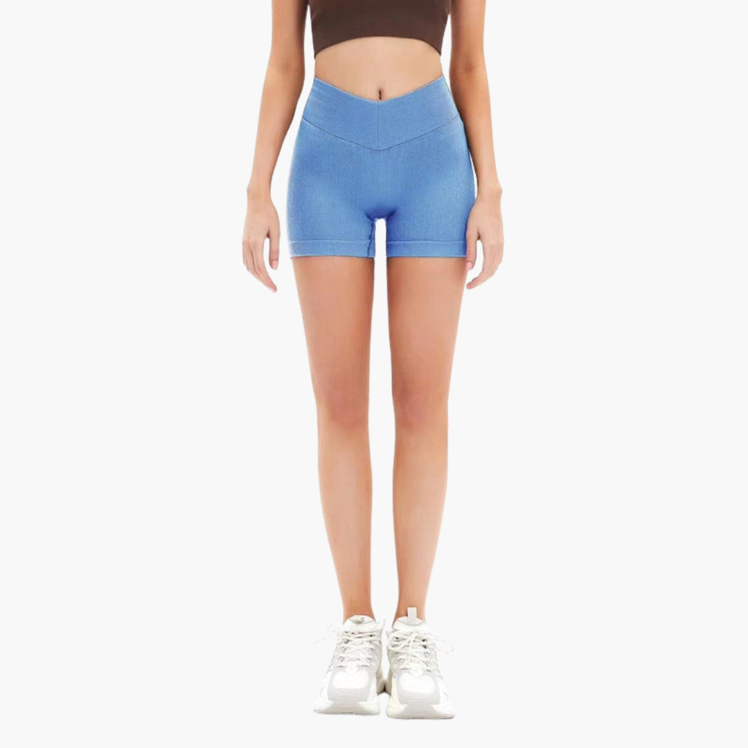 Γυναικεία αθλητικά σορτς με ψηλή μέση, εξοπλισμένα με ελαστική μέση για στήριξη. Διαθέτουν ορατό ριμπ μοτίβο και κοντά πόδια που φτάνουν πάνω από το γόνατο. Κατάλληλα για διάφορους τύπους δραστηριοτήτων, πλένονται στο πλυντήριο και στεγνώνουν γρήγορα, σχεδιασμένα για τακτική χρήση.