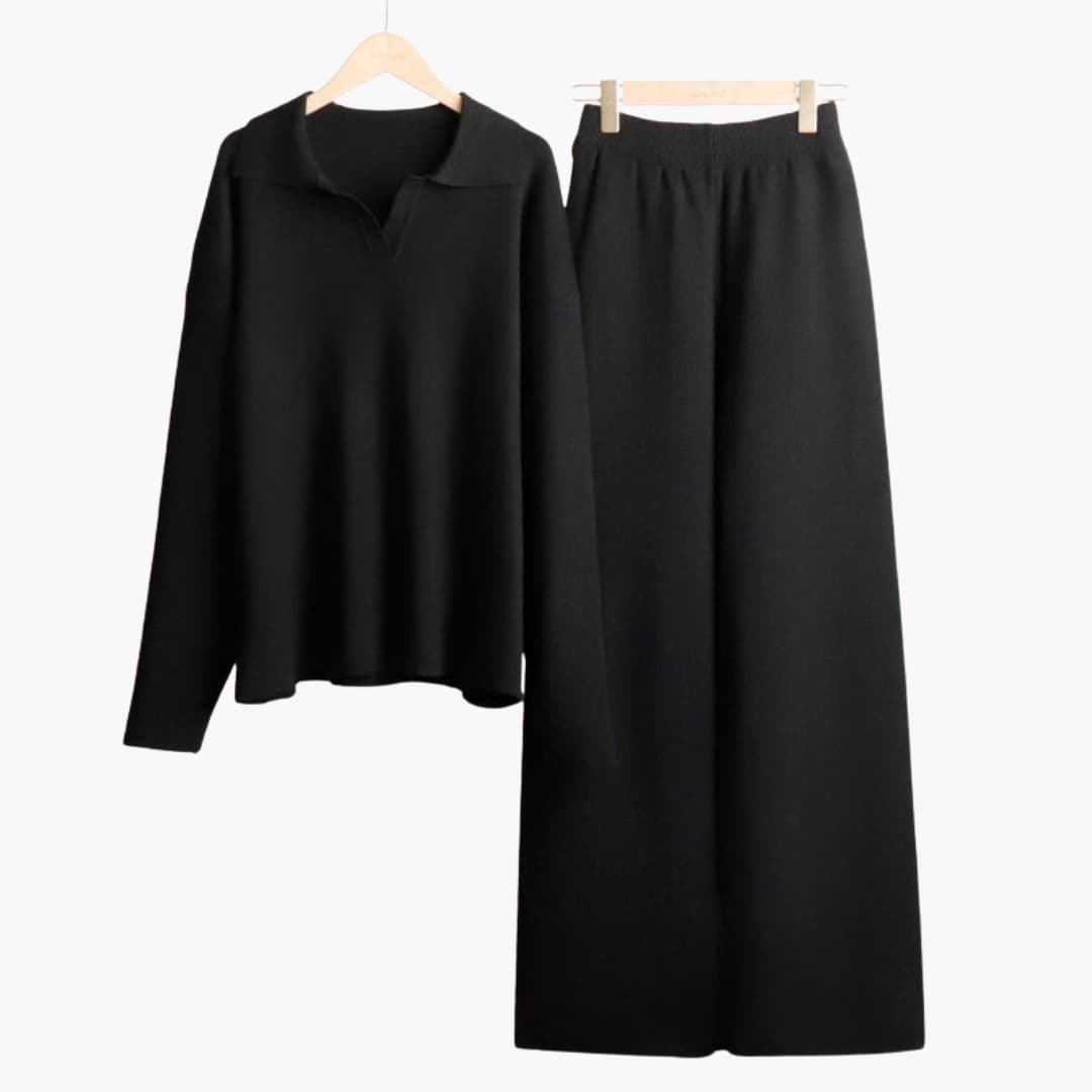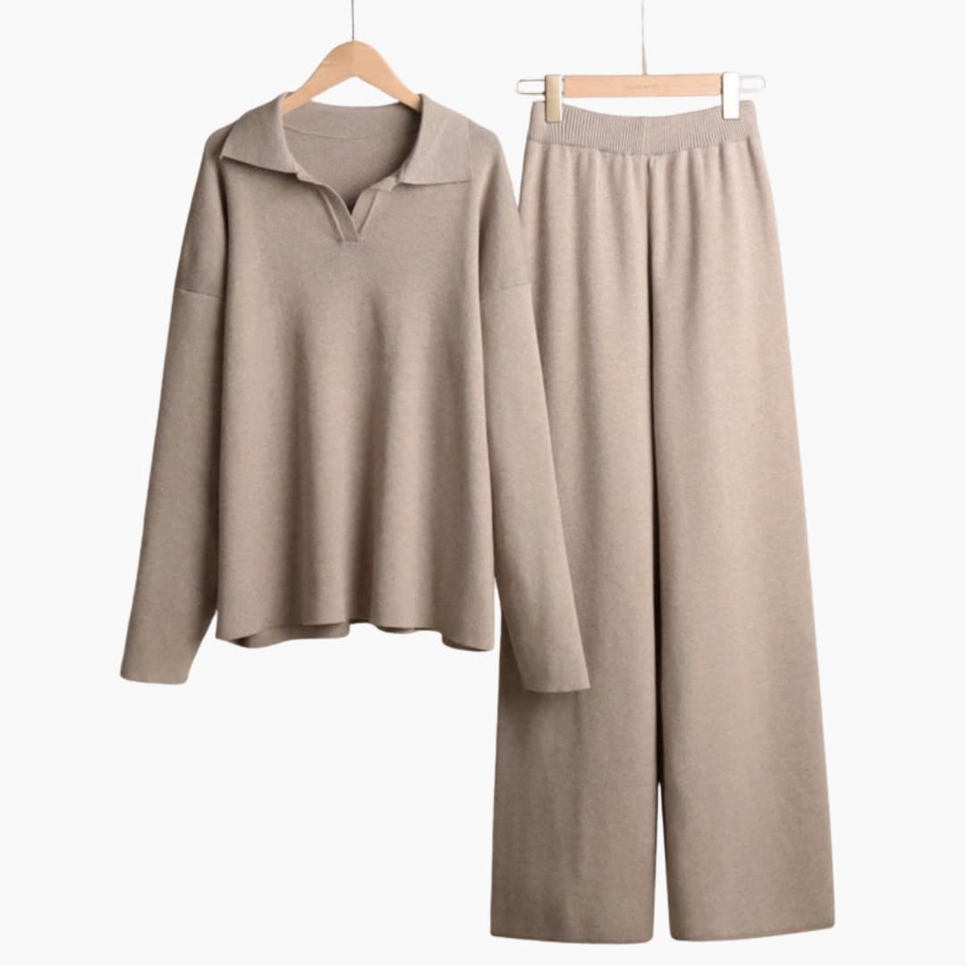 Αυτό το σετ γυναικείας άνετης ένδυσης περιλαμβάνει πουλόβερ με κλασικό υπερμεγέθη γιακά, χαμηλωμένους ώμους και μακριά μανίκια, συνδυασμένο με φαρδιά παντελόνια με ελαστική ζώνη μέσης. Και τα δύο κομμάτια διαθέτουν επιφάνεια από συμπαγές υφαντό ύφασμα, κατάλληλο για στρώσεις ή συντονισμένη χρήση. Το σετ προσφέρει χαλαρή εφαρμογή ιδανική για το σπίτι, την αναψυχή ή casual εξόδους.