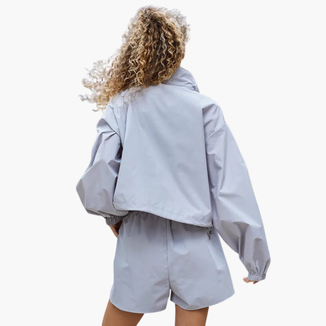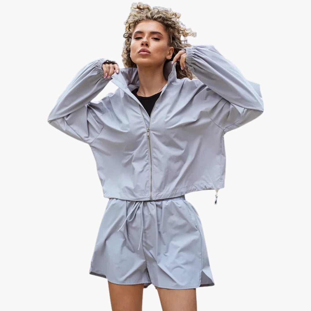 Σετ αθλητικών γυναικείων ρούχων με ζακέτα με φερμουάρ και σορτς με ελαστική μέση.