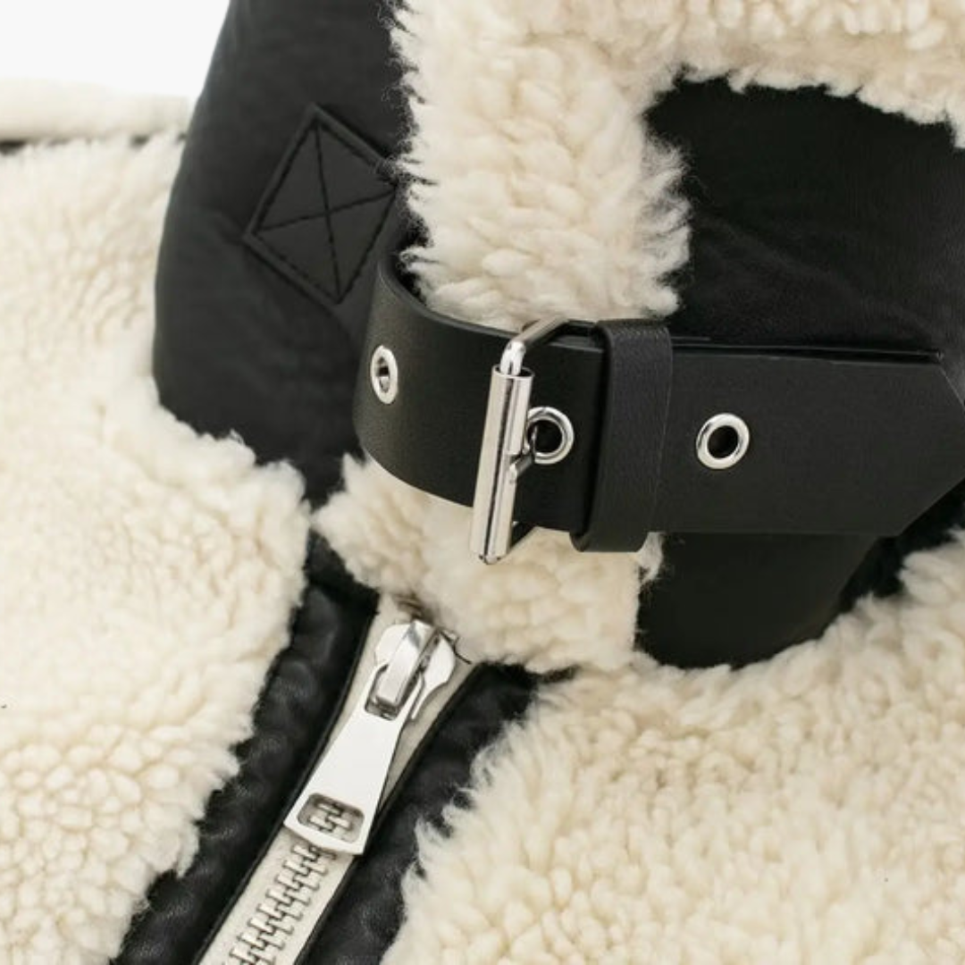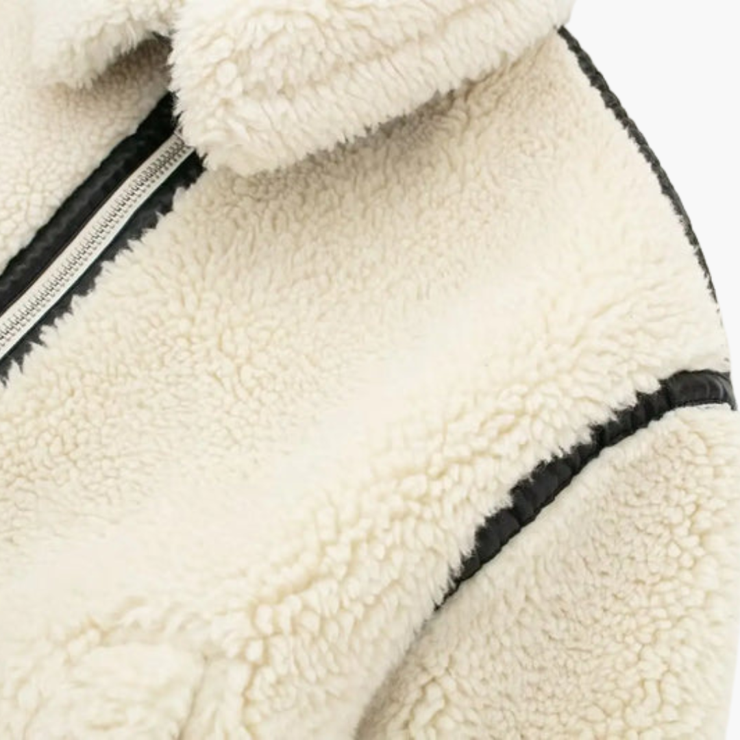 Αυτό το γυναικείο μπουφάν διαθέτει υφή teddy στο πάνω μέρος, φερμουάρ μπροστά και φαρδύ γιακά. Τα μακριά μανίκια έχουν αντίθετες ραφές που εκτείνονται κατά μήκος του τελειώματος του σώματος. Δύο μπροστινές τσέπες βρίσκονται στο κάτω μέρος, και η επιφάνεια διατηρεί ομοιόμορφη αφράτη υφή σε όλο το μήκος.