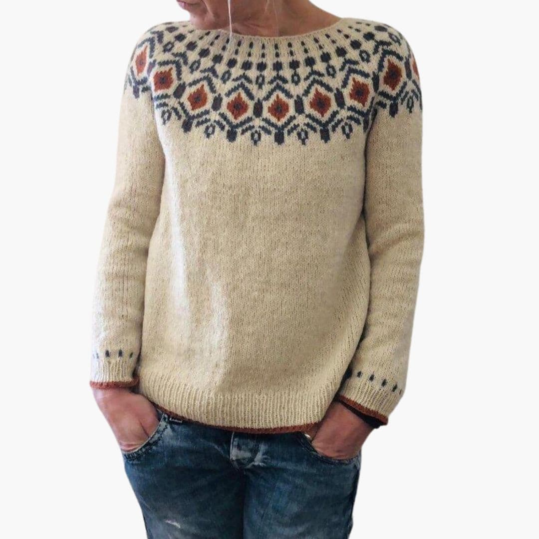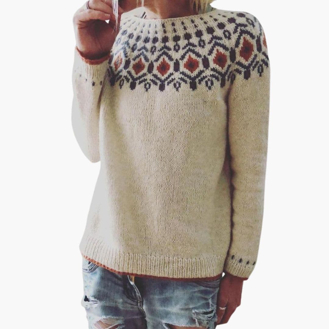 Γυναικείο πλεκτό πουλόβερ με γεωμετρικό σχέδιο γύρω από το λαιμό.