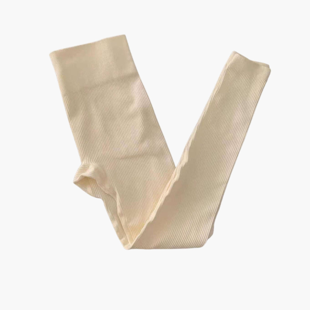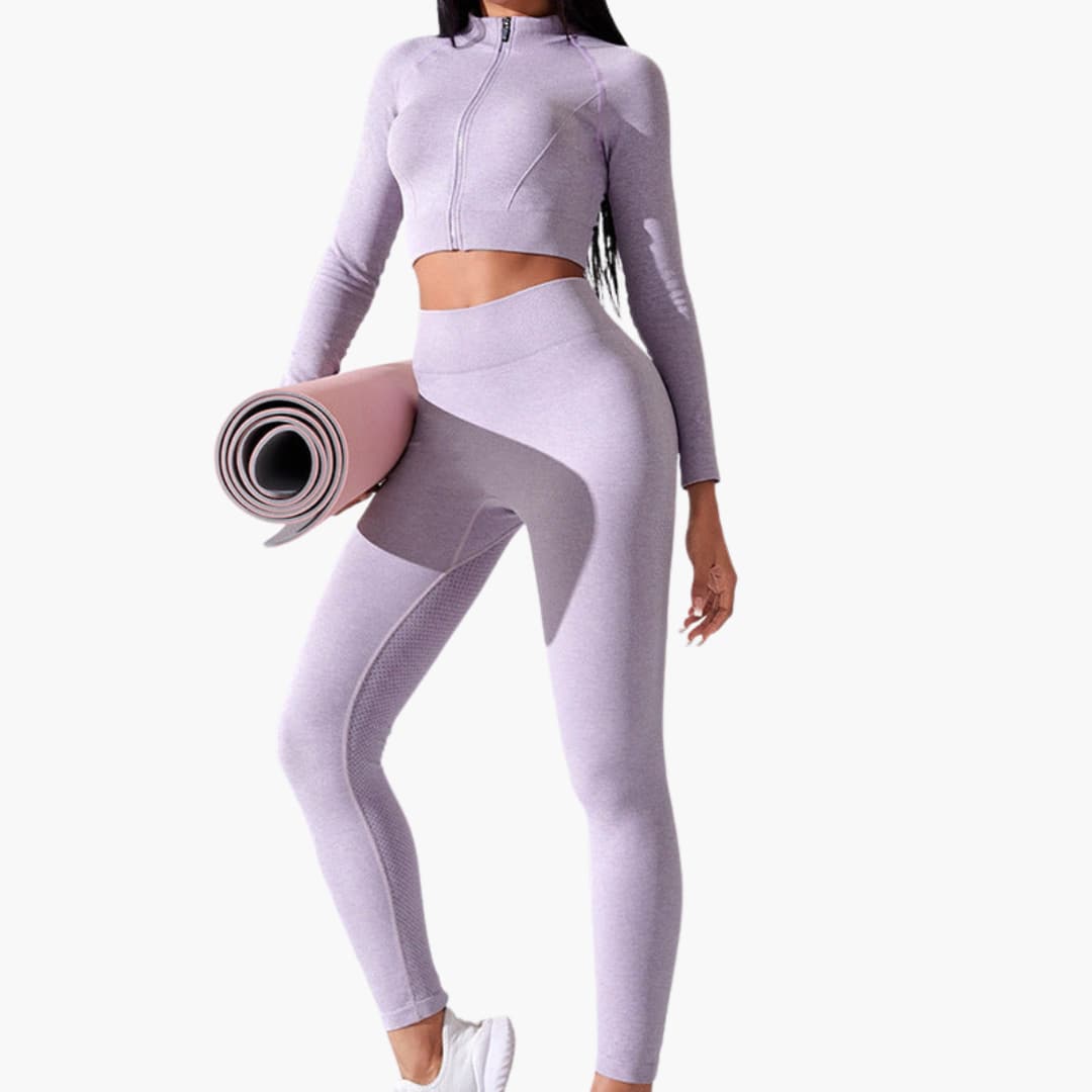 Naisten urheilupuku, jossa pitkähihaiset yläosat ja joustavat vyötäröhousut
