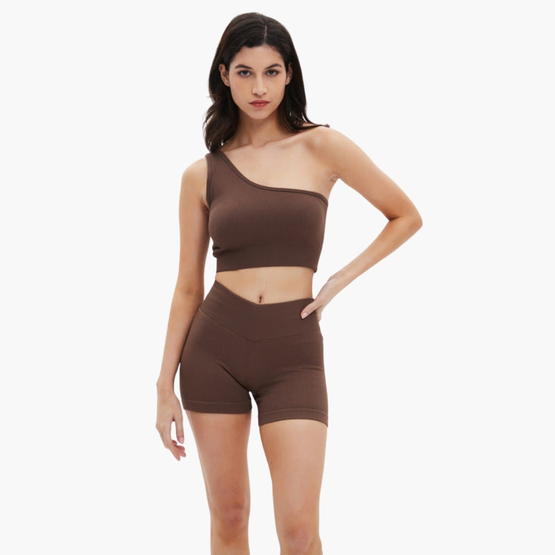 Naisten lyhyt urheilullinen setti ribbineuloksisella topilla ja shortseilla