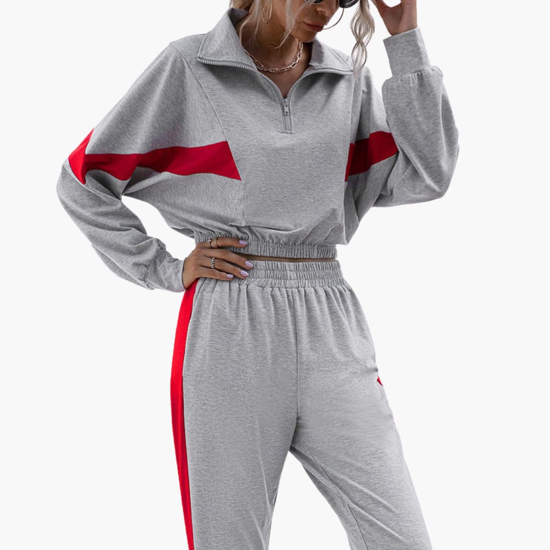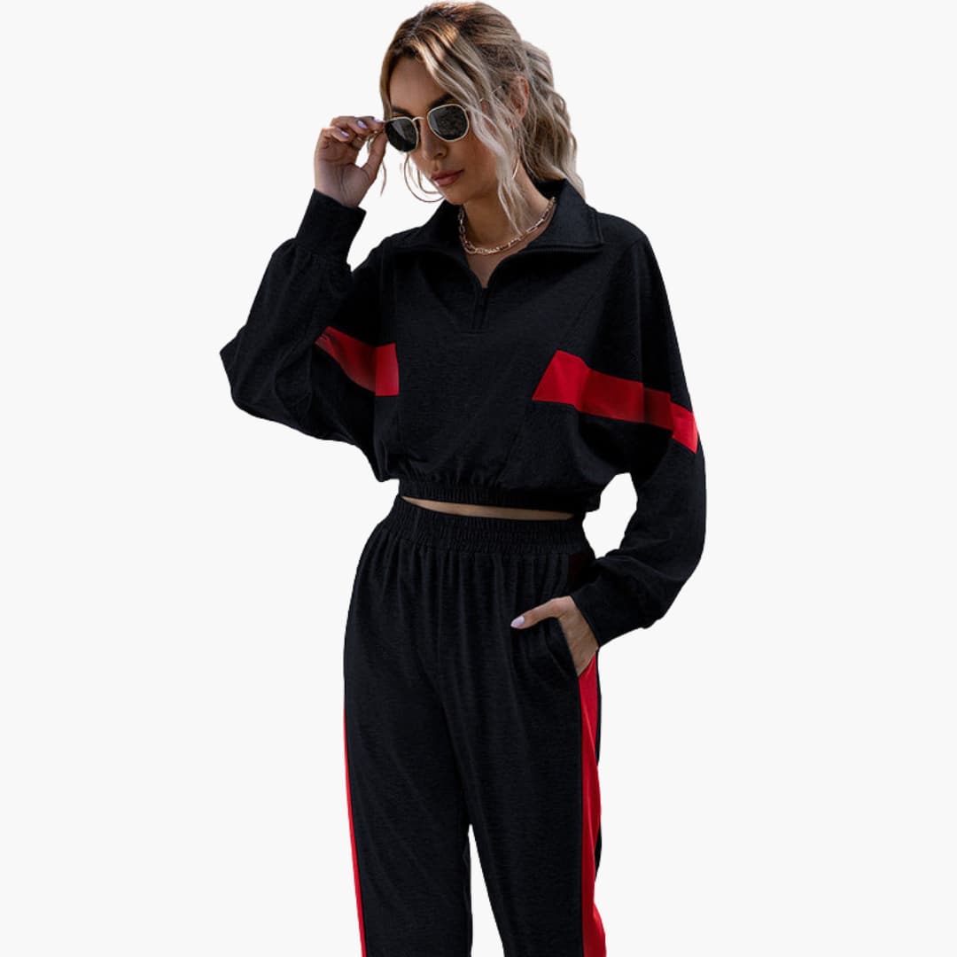 Naisten urheilupuku kontrastipaneelilla varustetulla topilla ja joustavavyötäröisillä housuilla