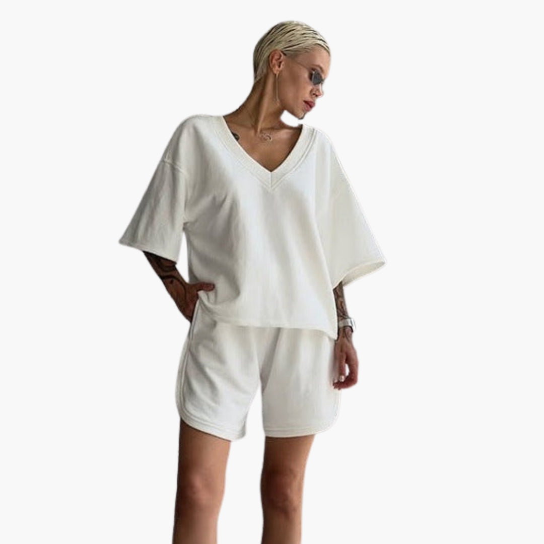 Naisten urheilupuku V-kaula-aukkoinen paita ja väljät shortsit