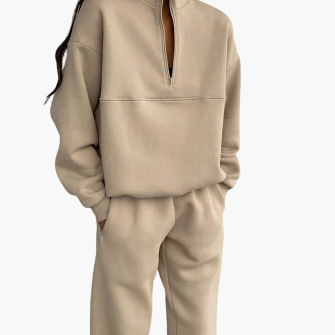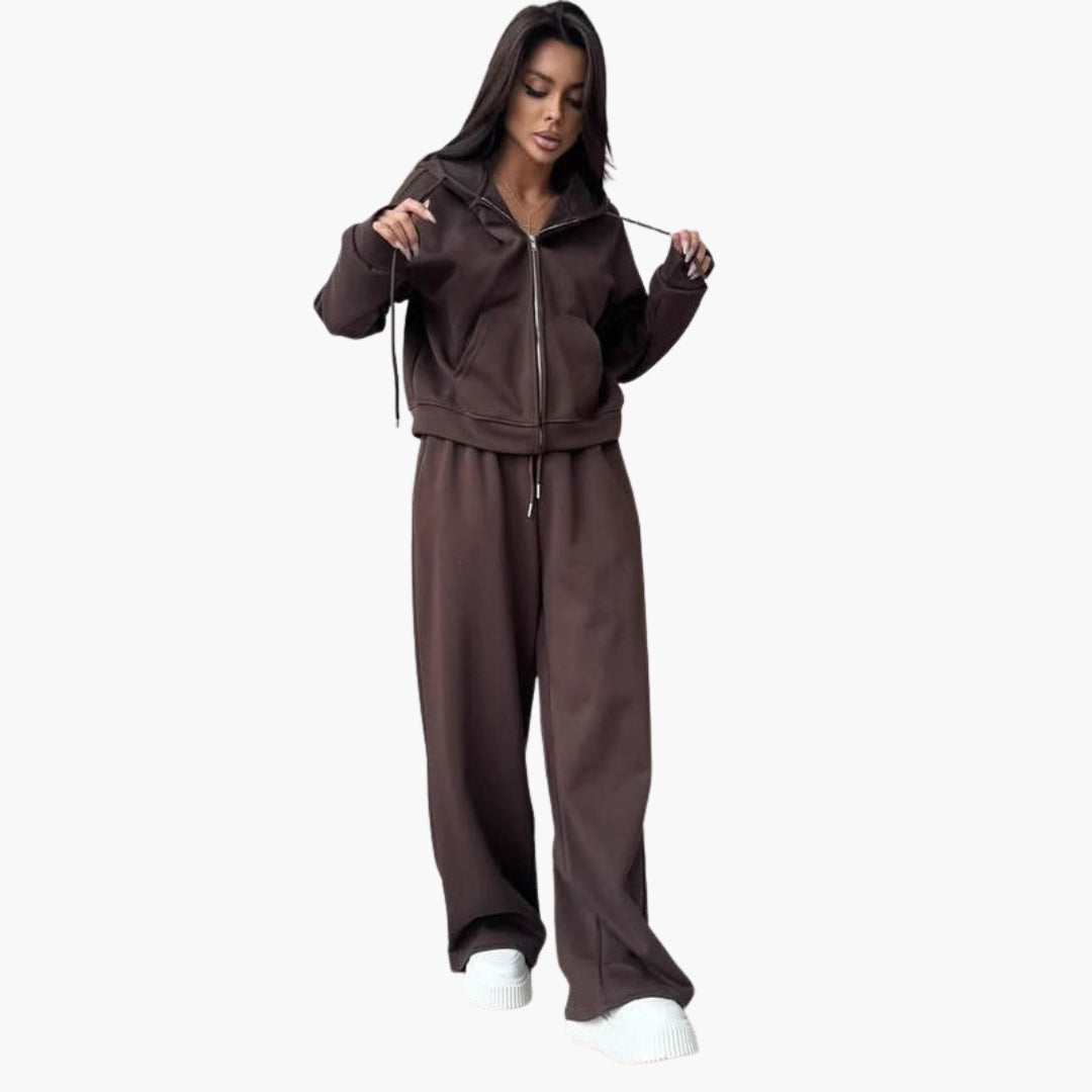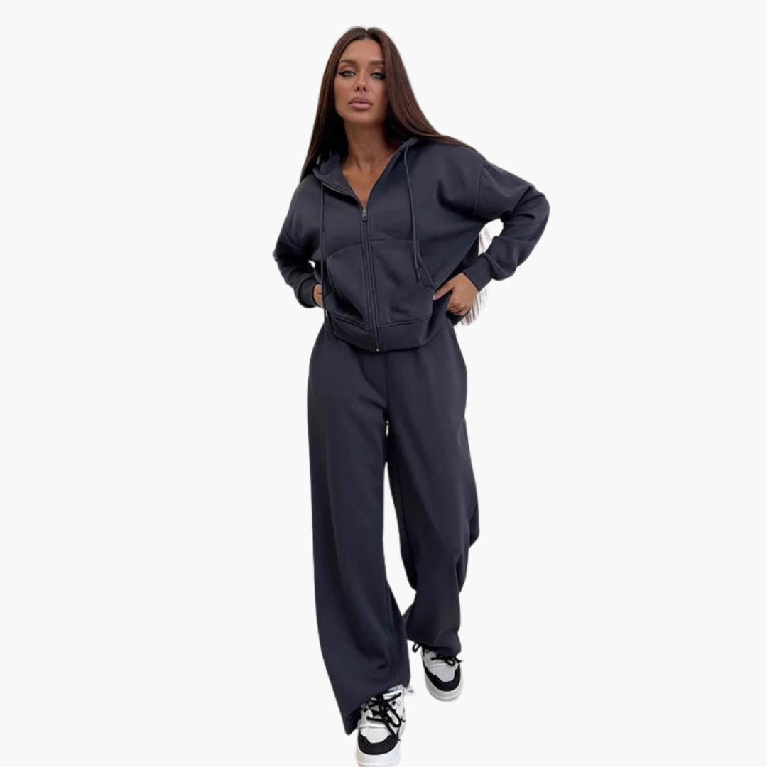 Naisten urheilupuku vetoketjullisella takilla ja leveillä housuilla