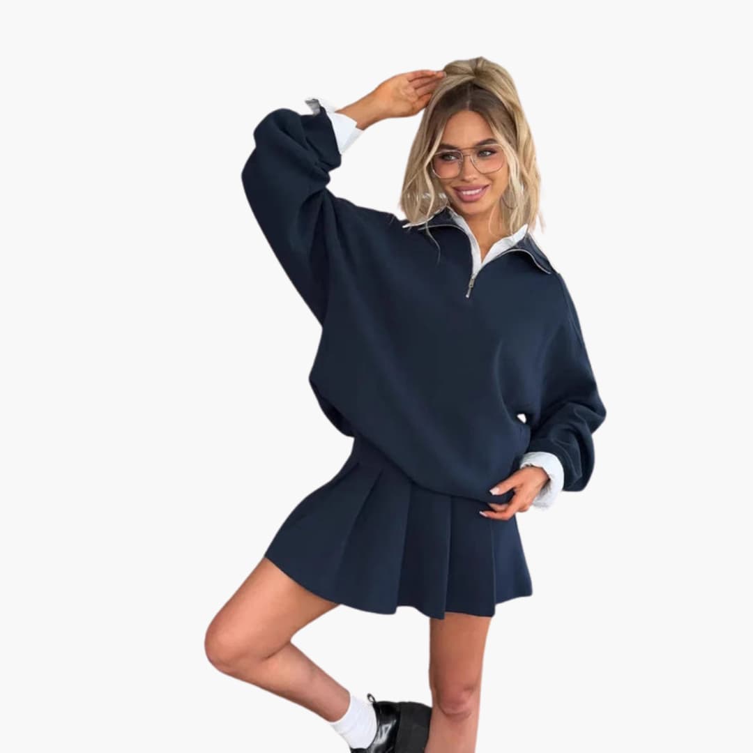 Naisten setti vetoketjullisella kauluksella varustetulla neuleella, pitkillä hihoilla ja sisätopilla