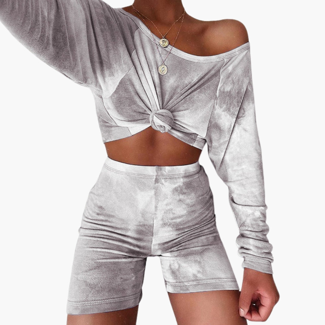 Naisten urheilupuku solmittavalla topilla ja istuvilla shortseilla