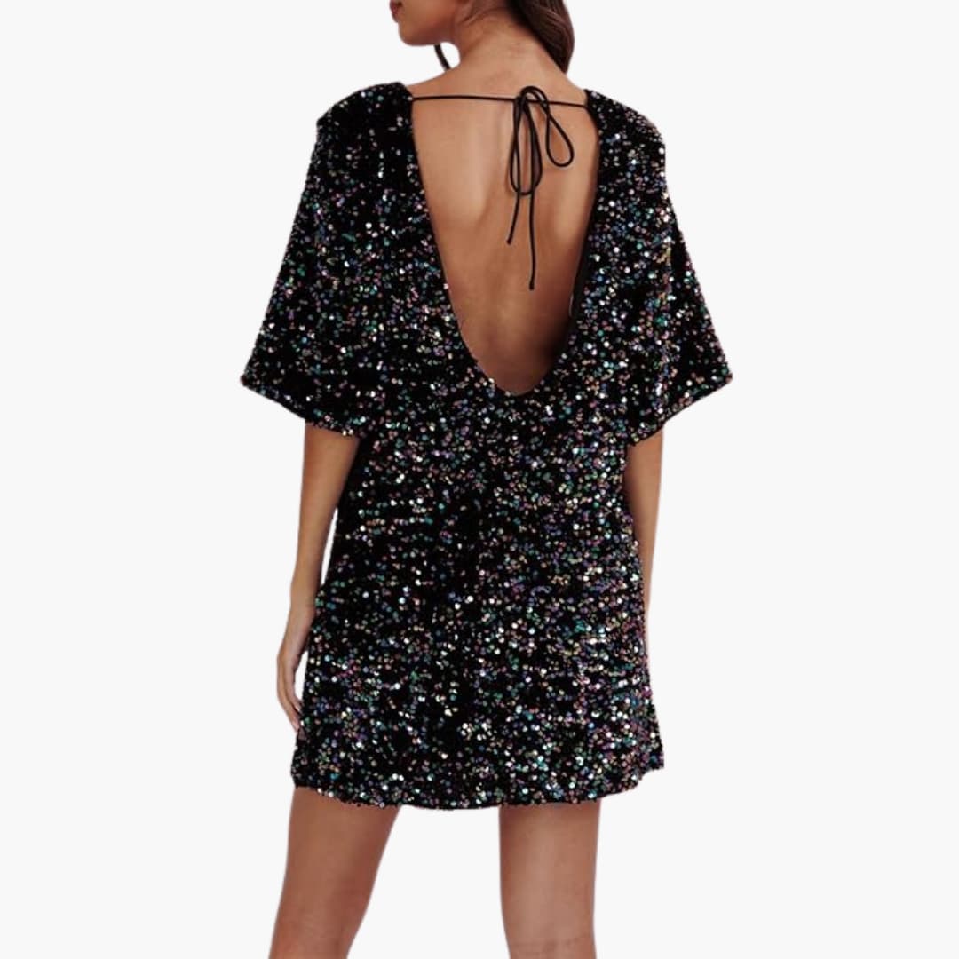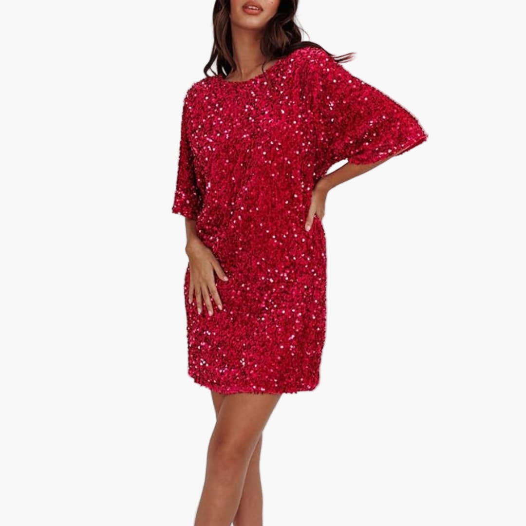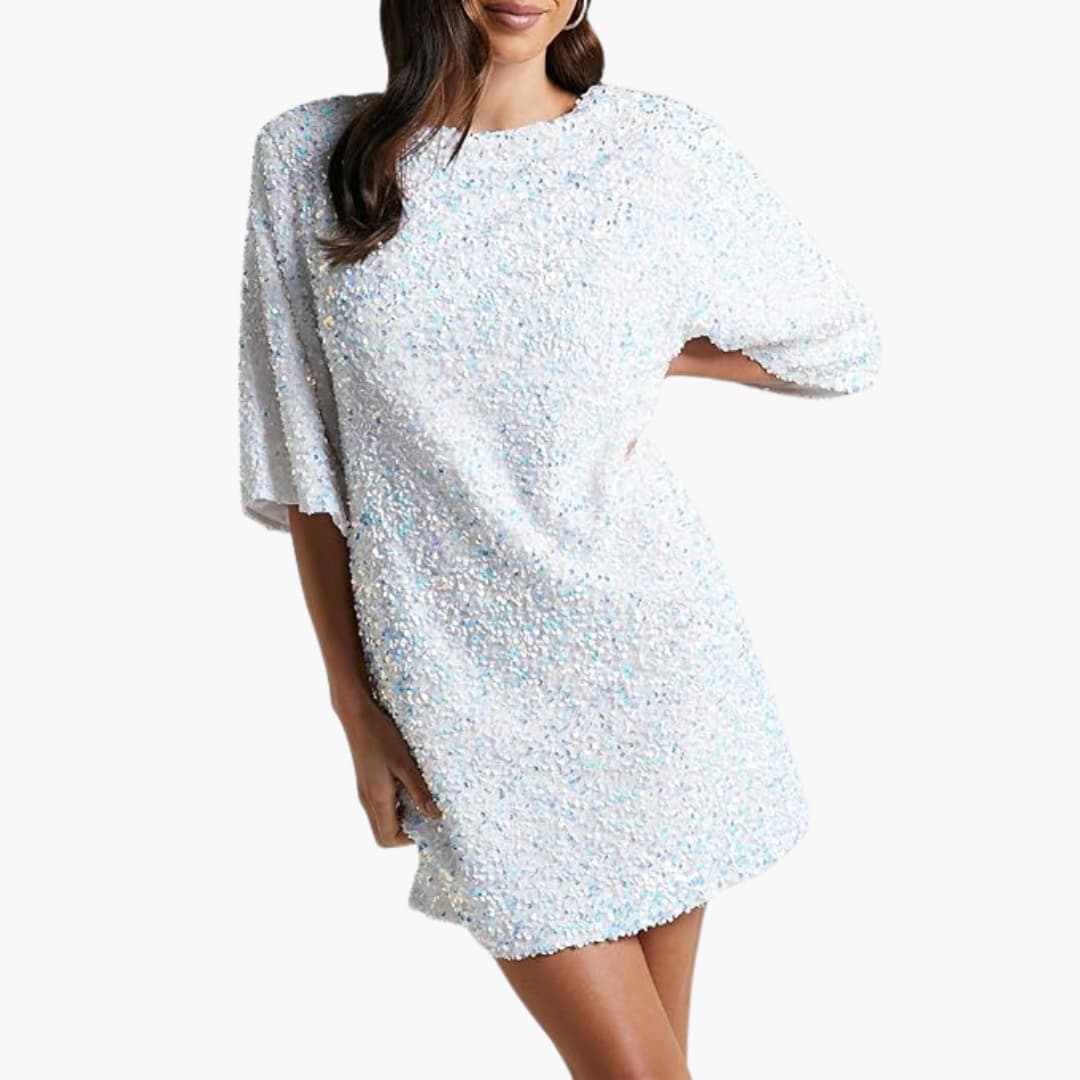 Naisten paljettimekko pyöreällä pääntiellä ja liehuvilla hihoilla
