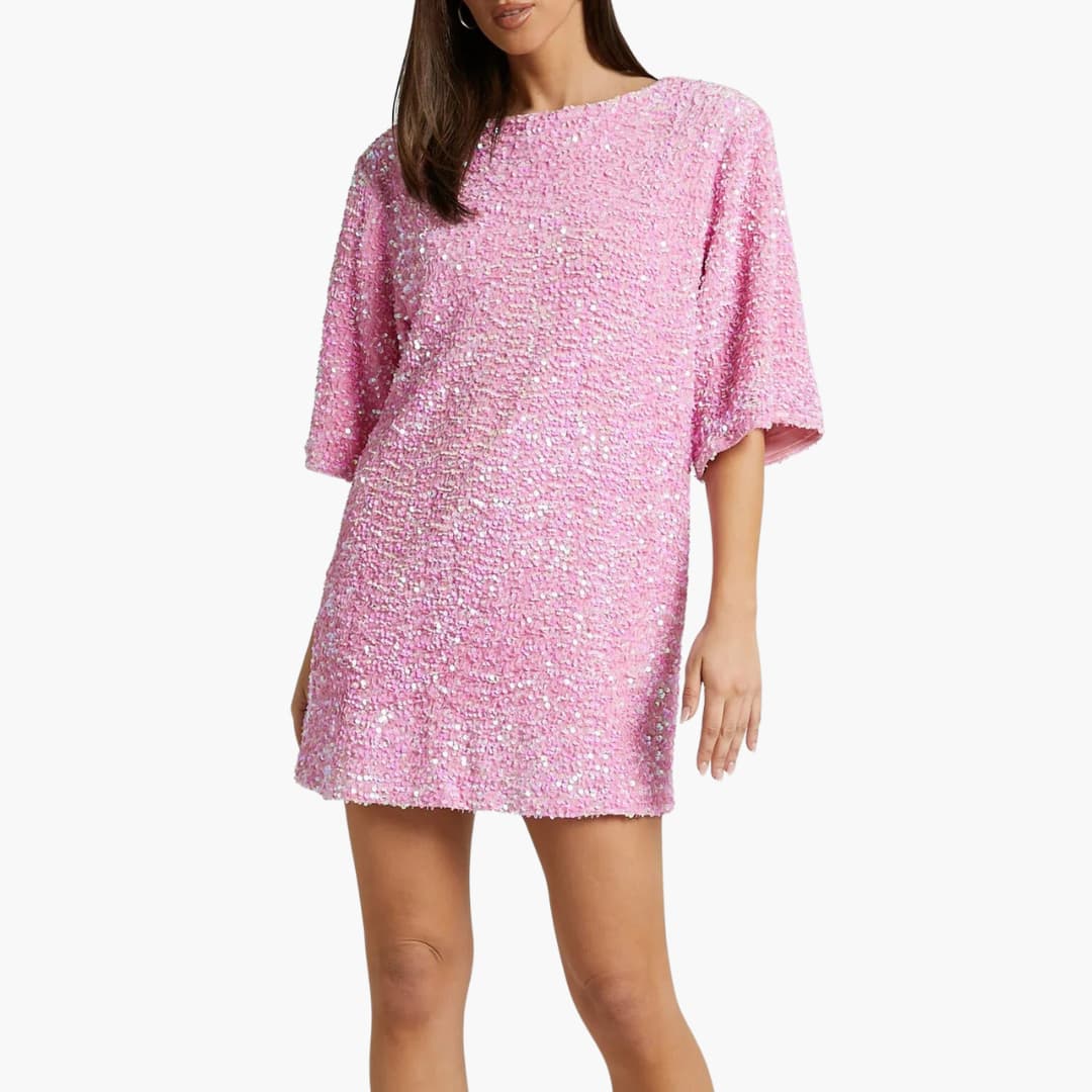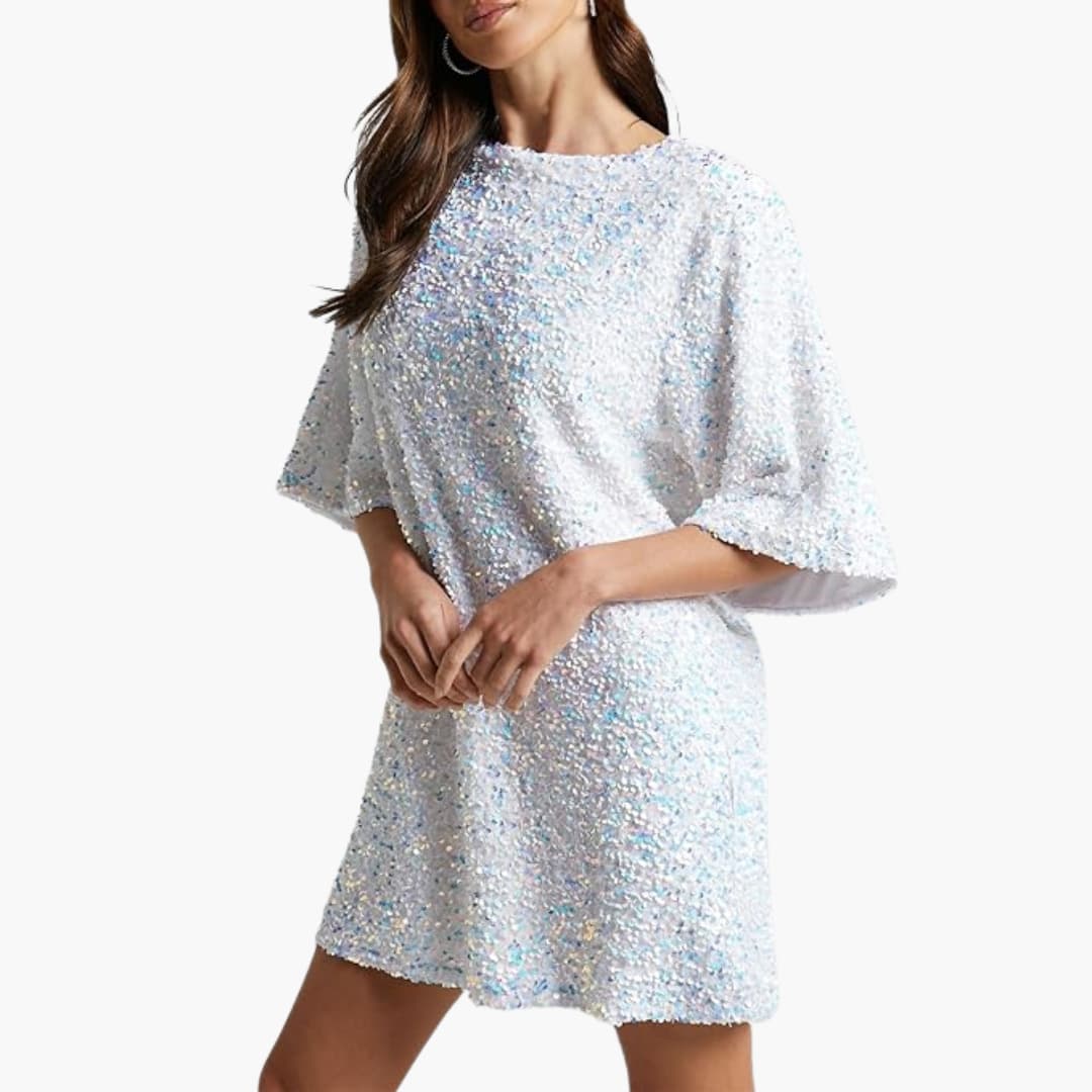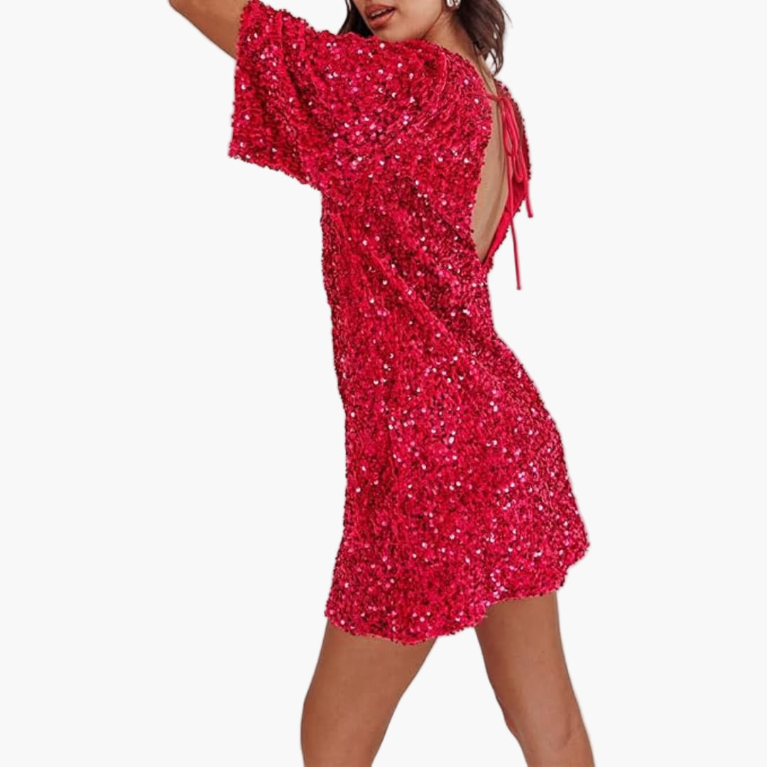 Naisten paljettimekko pyöreällä pääntiellä ja liehuvilla hihoilla