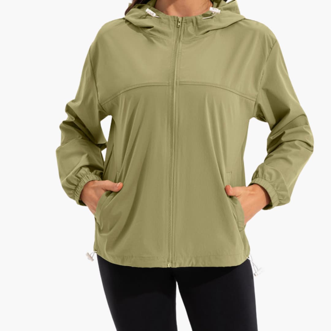 Naisten laskettelutakki hupulla ja vetoketjullisilla taskuilla