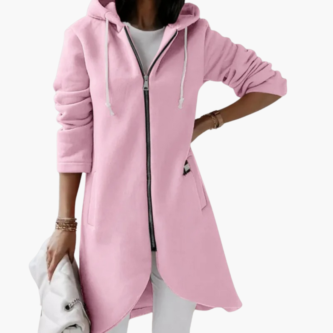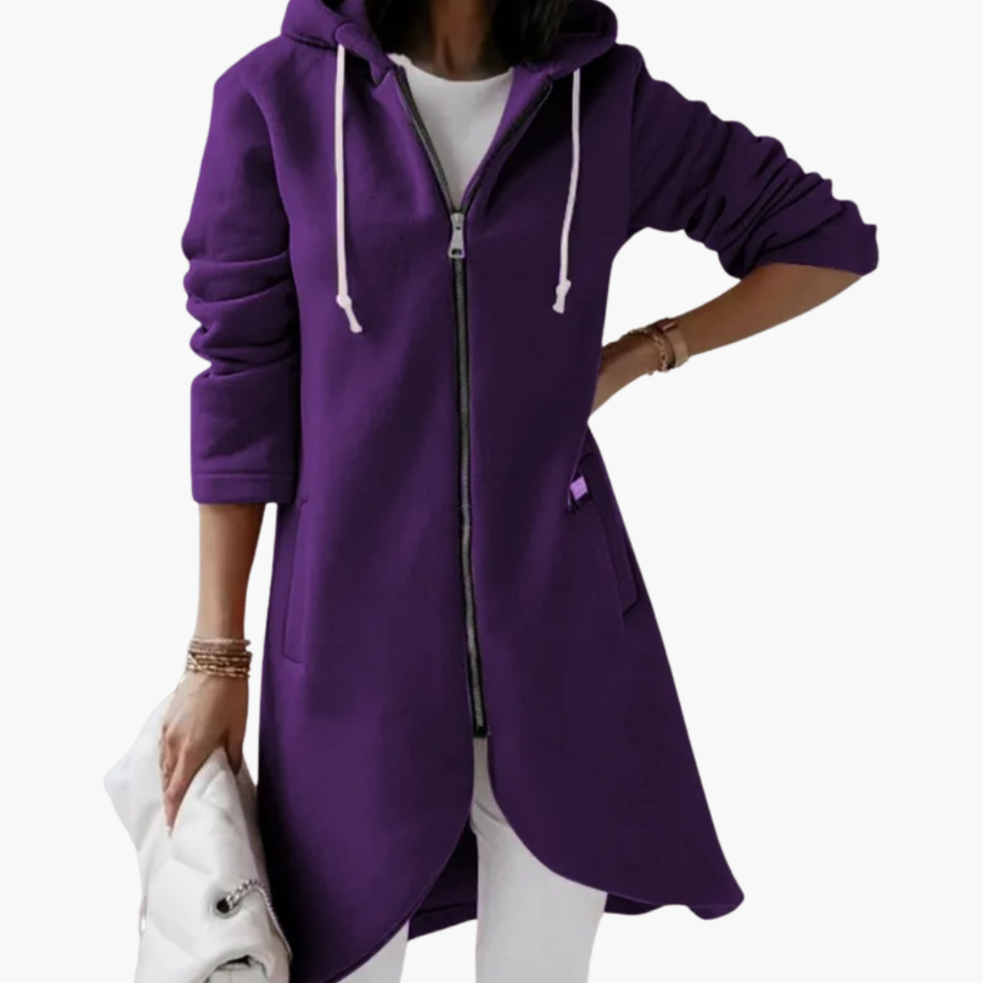 Pitkä naisten neuletakki hupulla ja vetoketjusuljennalla