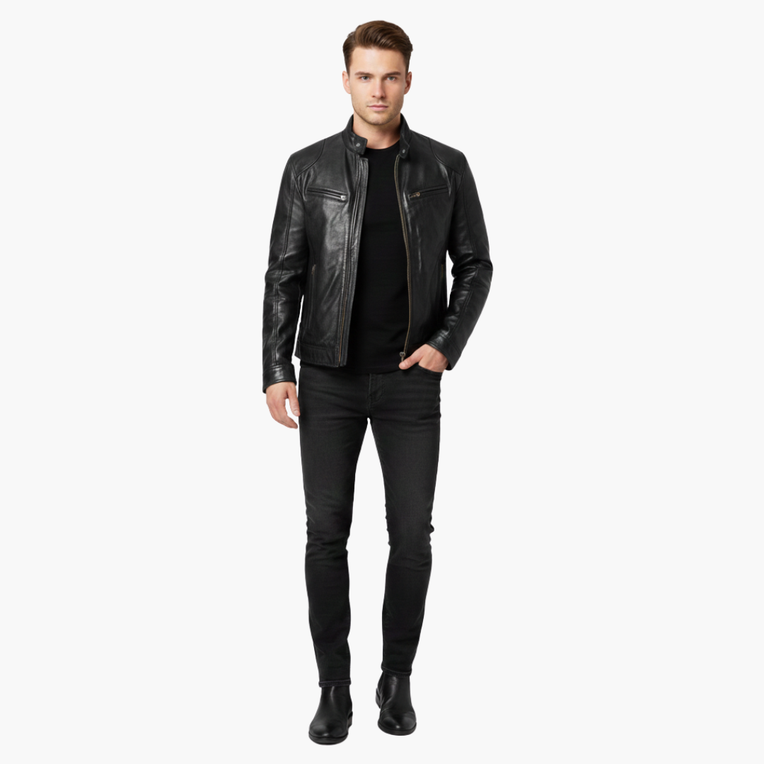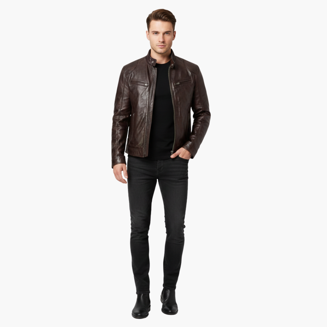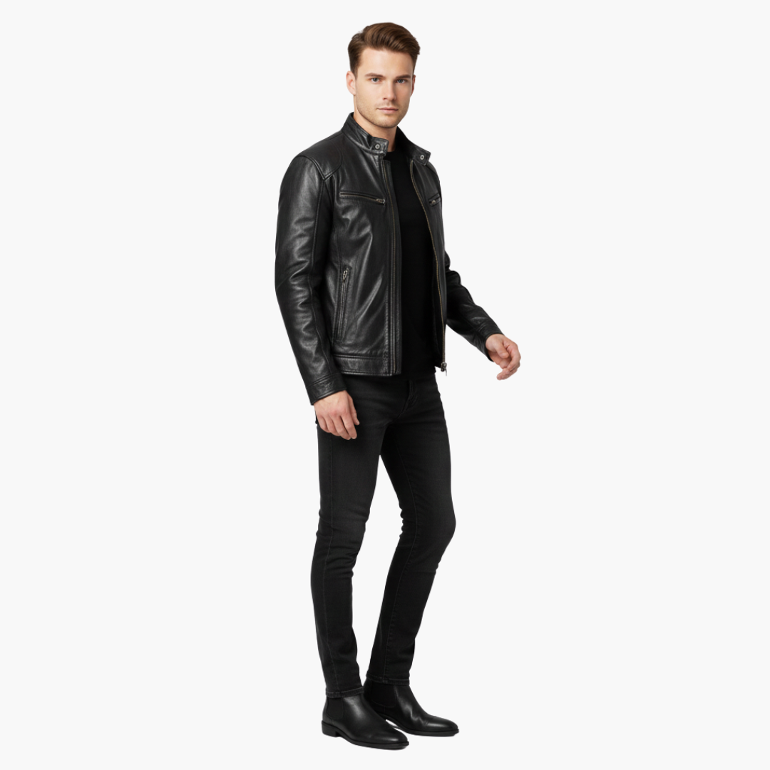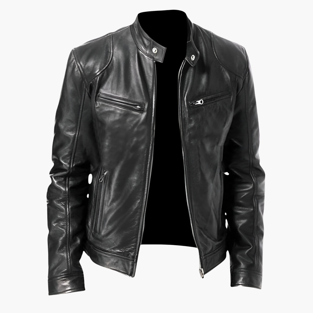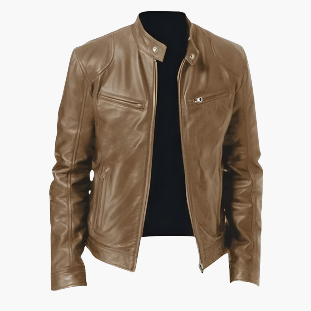 Miesten takki korkealla kauluksella, vetoketjusuljennalla ja vetoketjullisilla taskuilla edessä.
