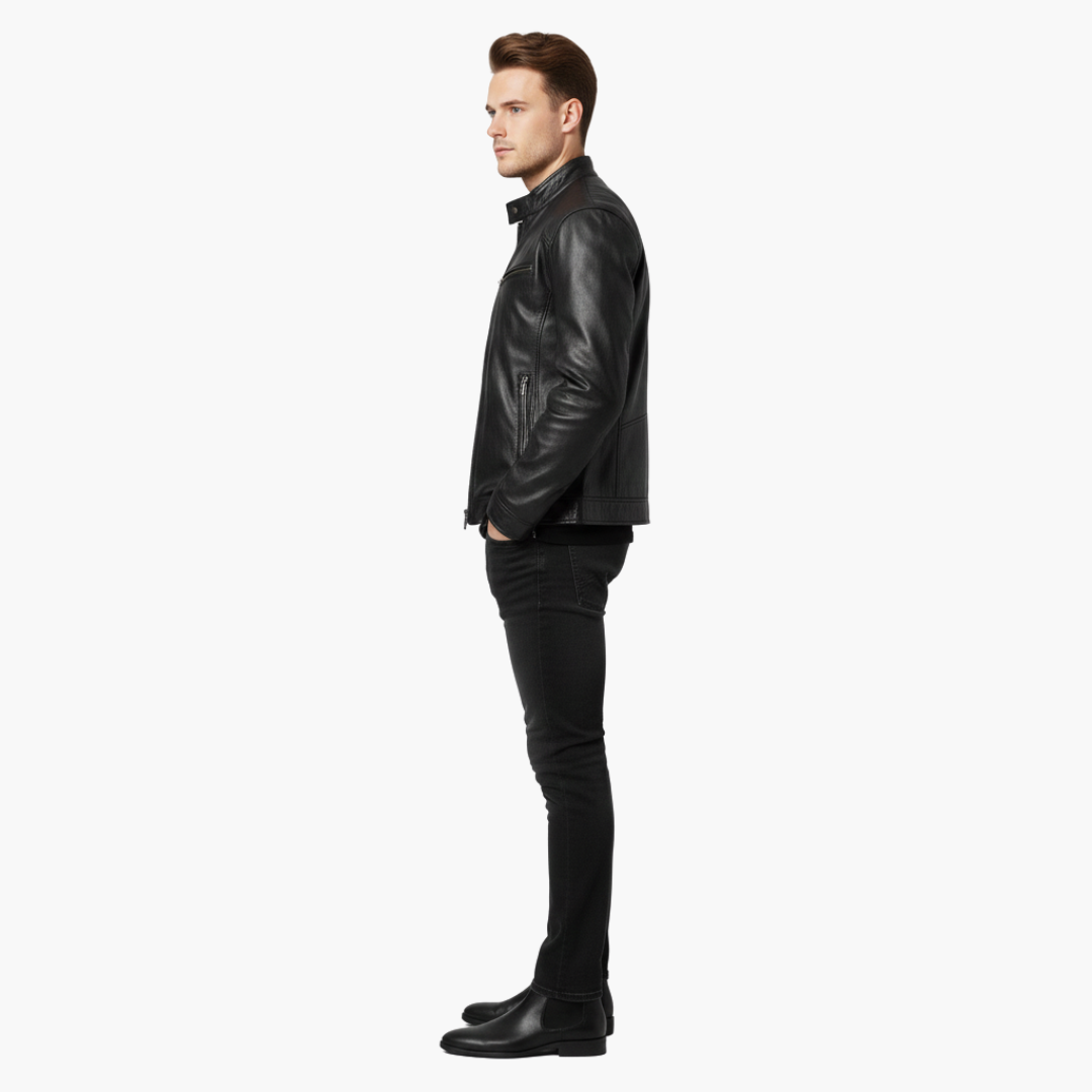 Tässä miesten takissa on korkea kaulus, jossa on nepparilista, ja edessä vetoketjusuljenta. Kaksi pystysuoraa vetoketjullista taskua on rinnassa, ja lisävetoketjulliset taskut sijaitsevat sivuilla vyötäröllä. Pitkät hihat ovat istuvat ranteissa. Ulkopinta on yksivärinen ja hienovaraisesti teksturoitu.