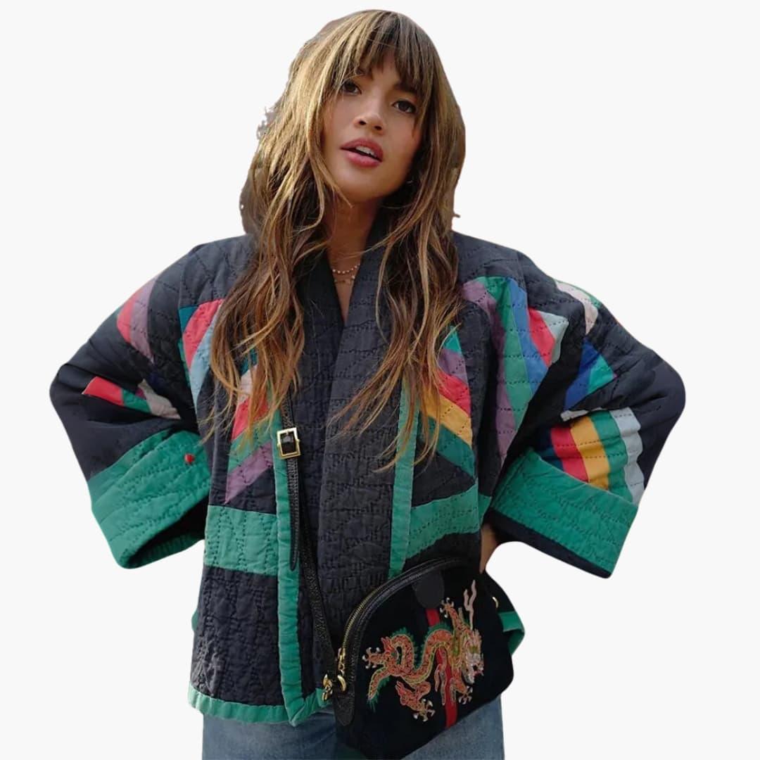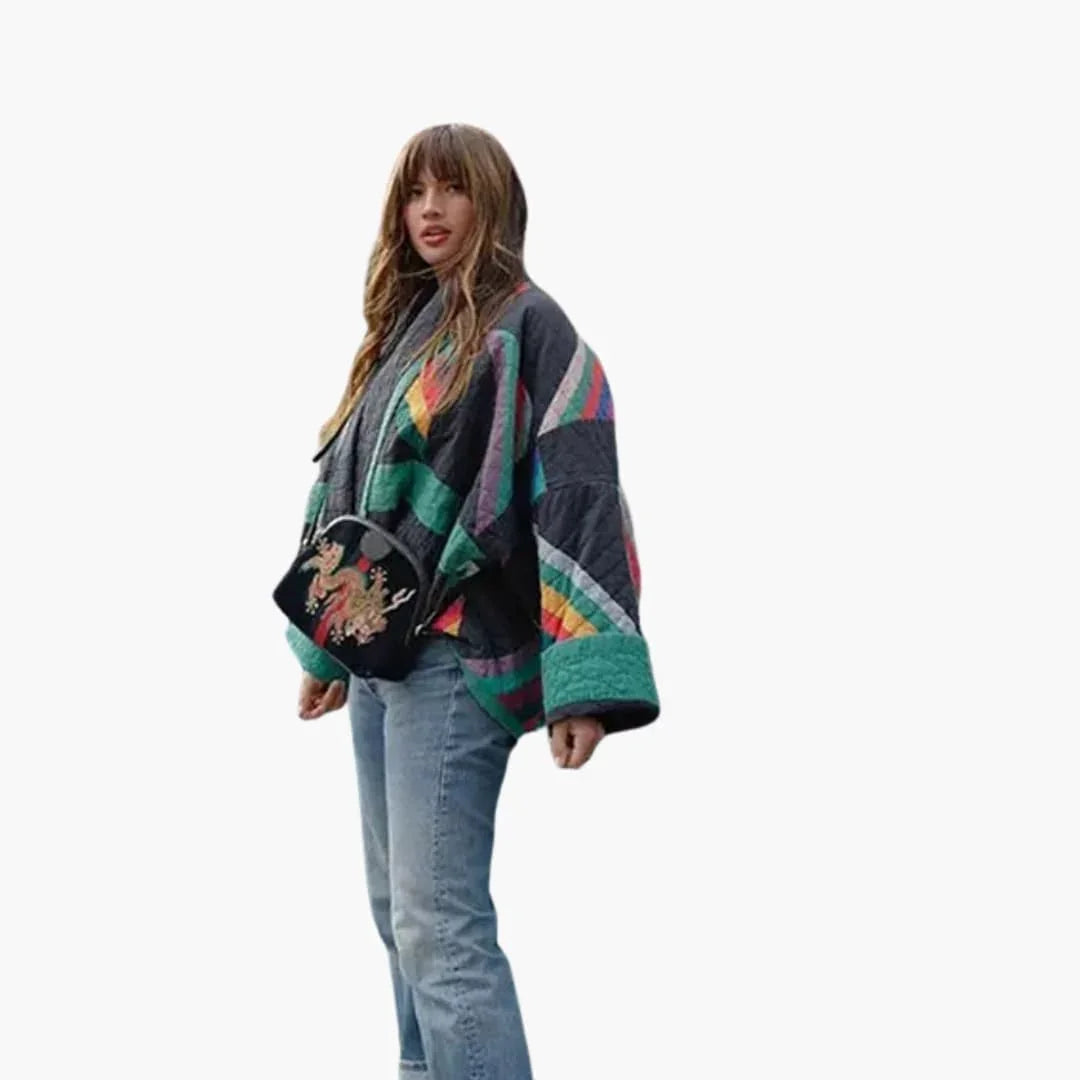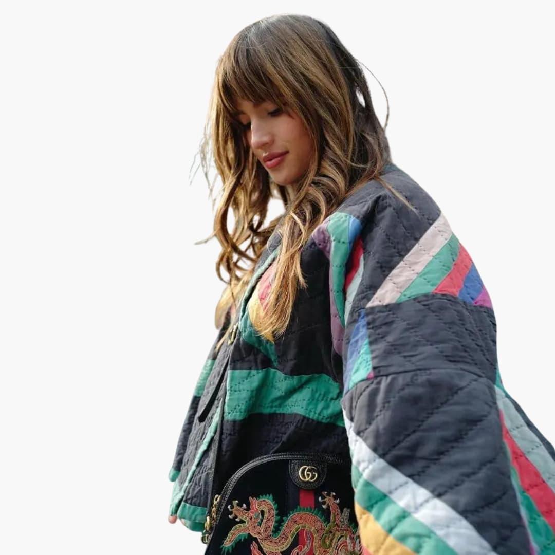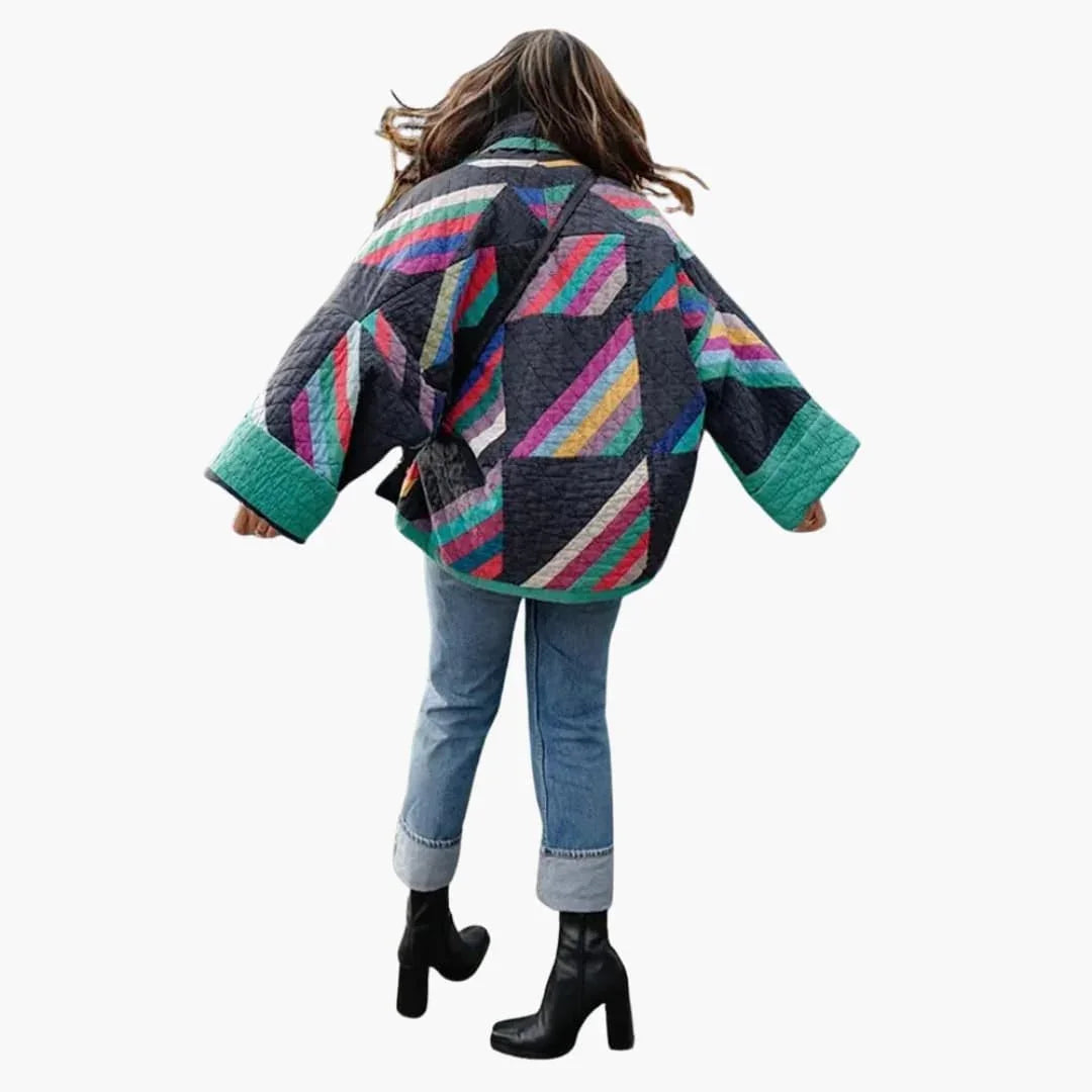 Tässä naisten tikkitakissa on etuaukko ilman nappeja tai vetoketjuja. Pitkät hihat päättyvät leveisiin hihansuihin, ja suora helma luo tasapainoisen siluetin. Sen pinta esittelee tikkikuvioidun tilkkutäkku-kuvion, jossa moniväriset paneelit on ommeltu vinosti ja järjestetty geometrisiin osioihin.