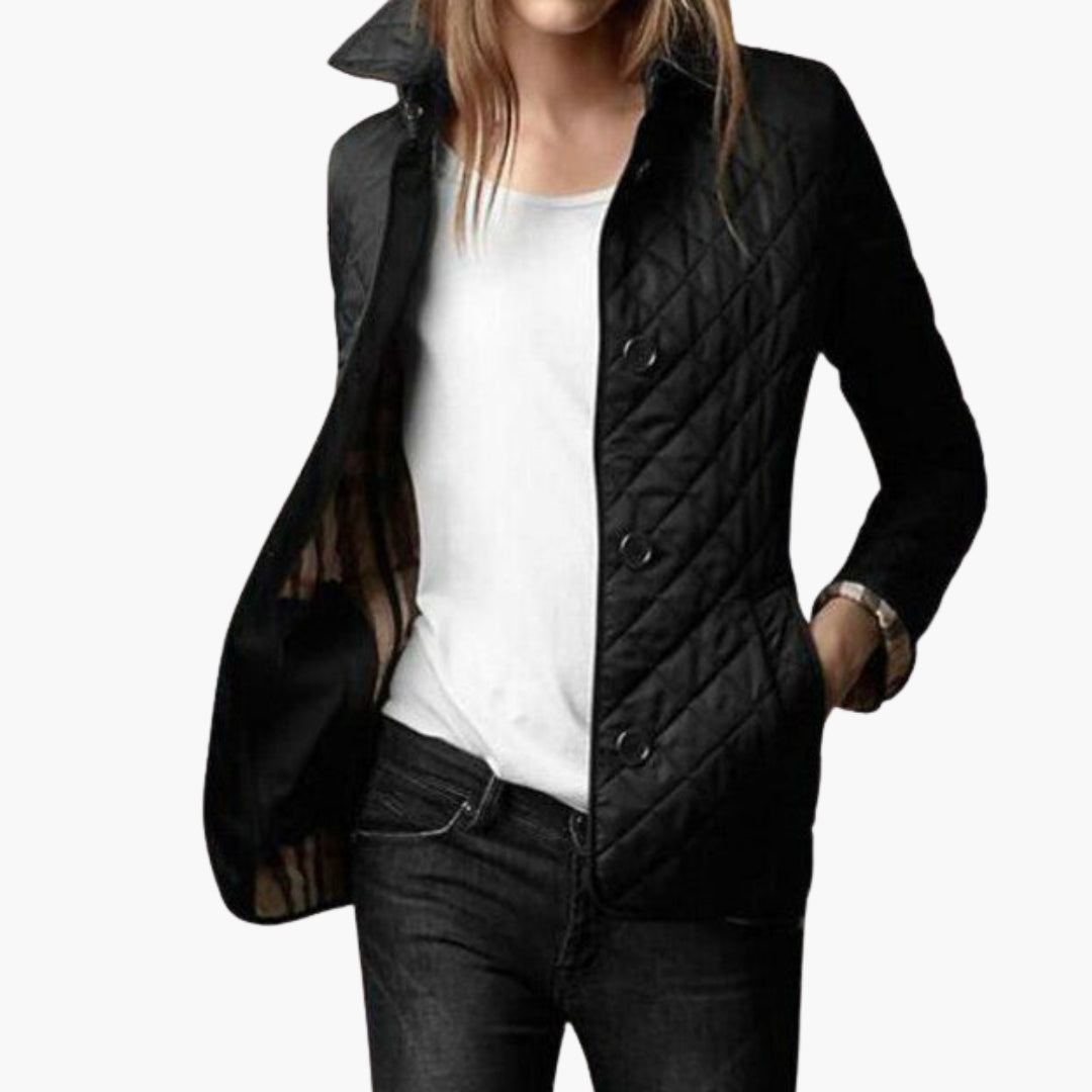 Tässä naisten takissa on timanttikuviointi, nappikiinnitys ja jämäkkä kaulus. Hihansuut voi kääntää paljastaen kontrastivärisen vuorin, mikä lisää hienovaraisen yksityiskohdan. Takana on muotoillut saumat korostamassa mallia, ja etutaskut tuovat käytännöllisyyttä. Tämä malli sopii helposti farkkujen tai housujen kanssa arkipukeutumiseen.