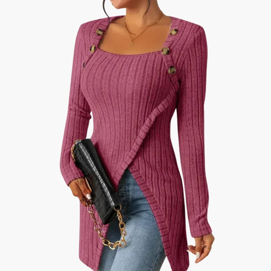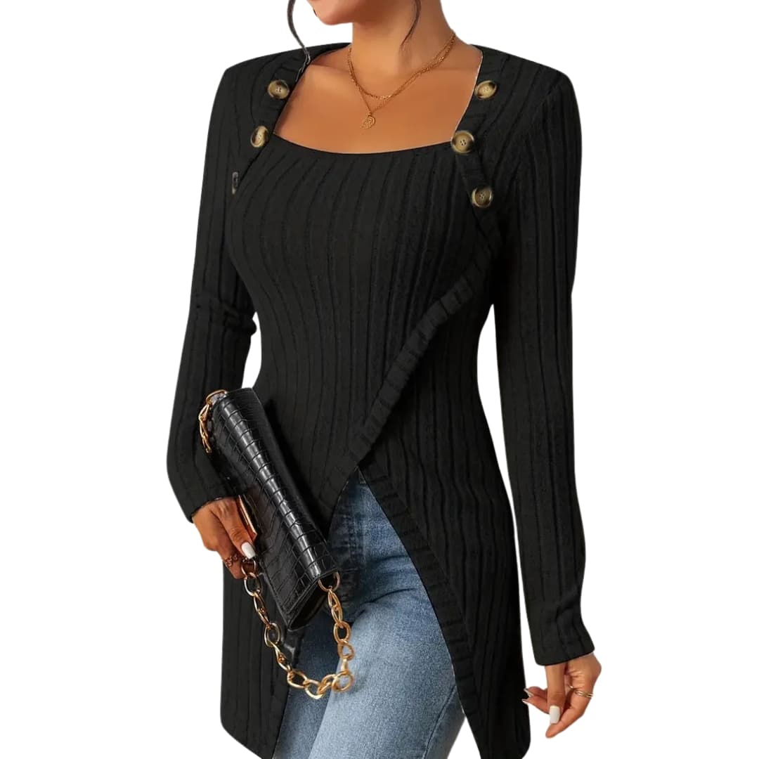 Tässä naisten resorineuletopissa on epäsymmetrinen leikkaus ja koristeelliset napit kaula-aukossa rakenteellista viimeistelyä varten. Sen vartalonmyötäiset pitkät hihat ja joustava materiaali ylläpitävät vaatteen muodon. Sopii hyvin farkkujen, hameen tai suorien housujen kanssa.