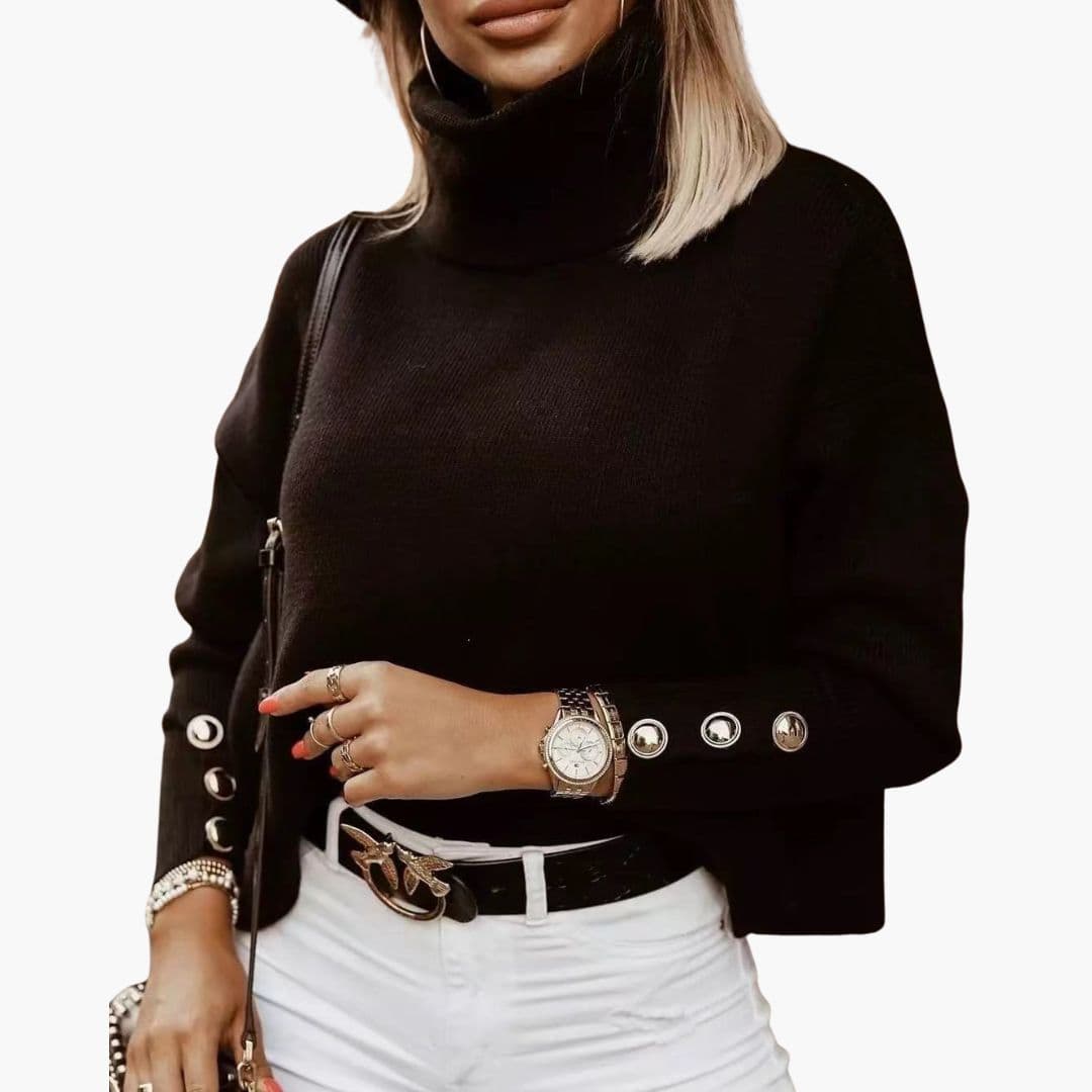 Naisten pooloneule, jossa metalliset napit hihoissa.
