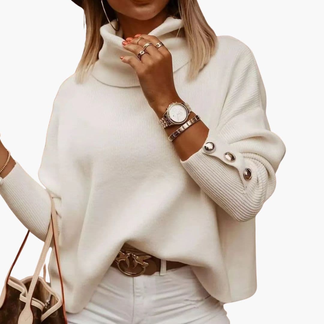Tässä naisten pooloneuleessa on pitkät hihat, ja sen erottuvana piirteenä on resorineulos sekä korkea kaulus. Suora leikkaus ja ilman suljinta oleva viimeistely luovat siistin mallin, joka sopii monenlaisiin tilaisuuksiin. Hihansuut on koristeltu metallisilla napeilla, jotka antavat erottuvan visuaalisen ilmeen. Tämä malli vedetään päälle ilman suljinta, ja se sopii yhdistettäväksi farkkujen, housujen tai hameen kanssa erilaisiin arkiasuihin.