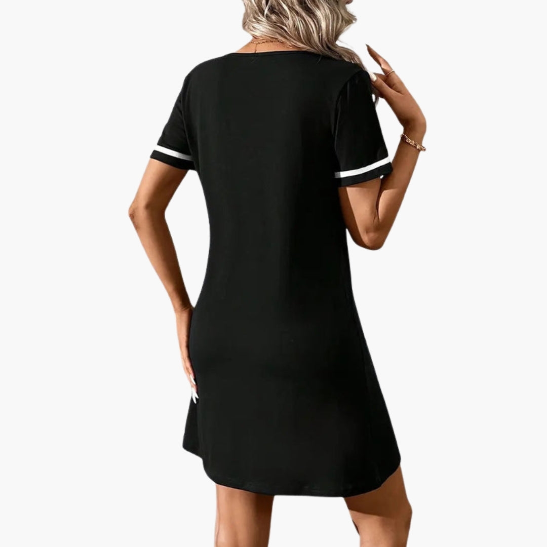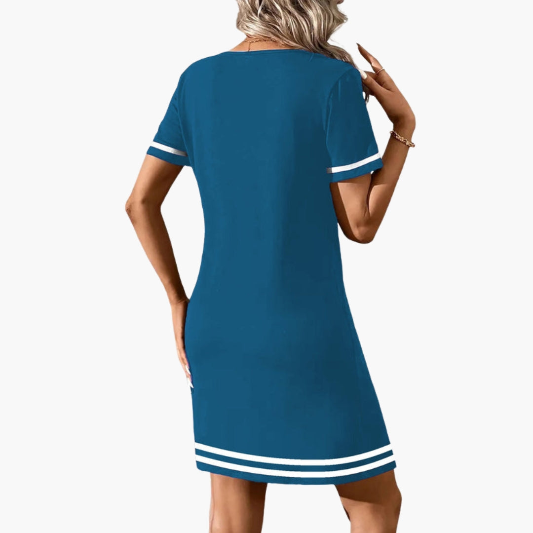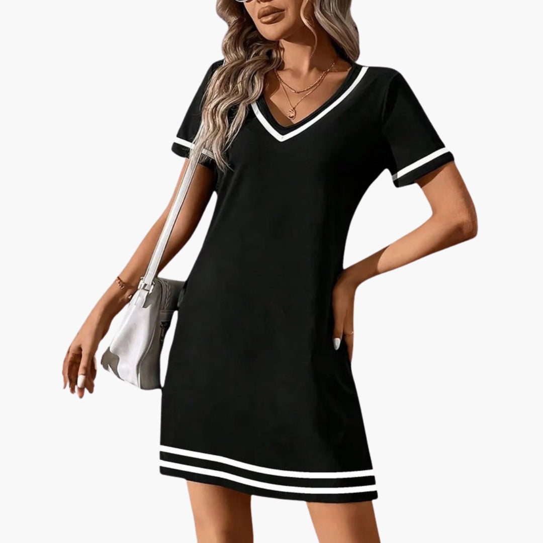 Urheilullinen naisten mekko V-pääntiellä ja kontrastivärisillä yksityiskohdilla.