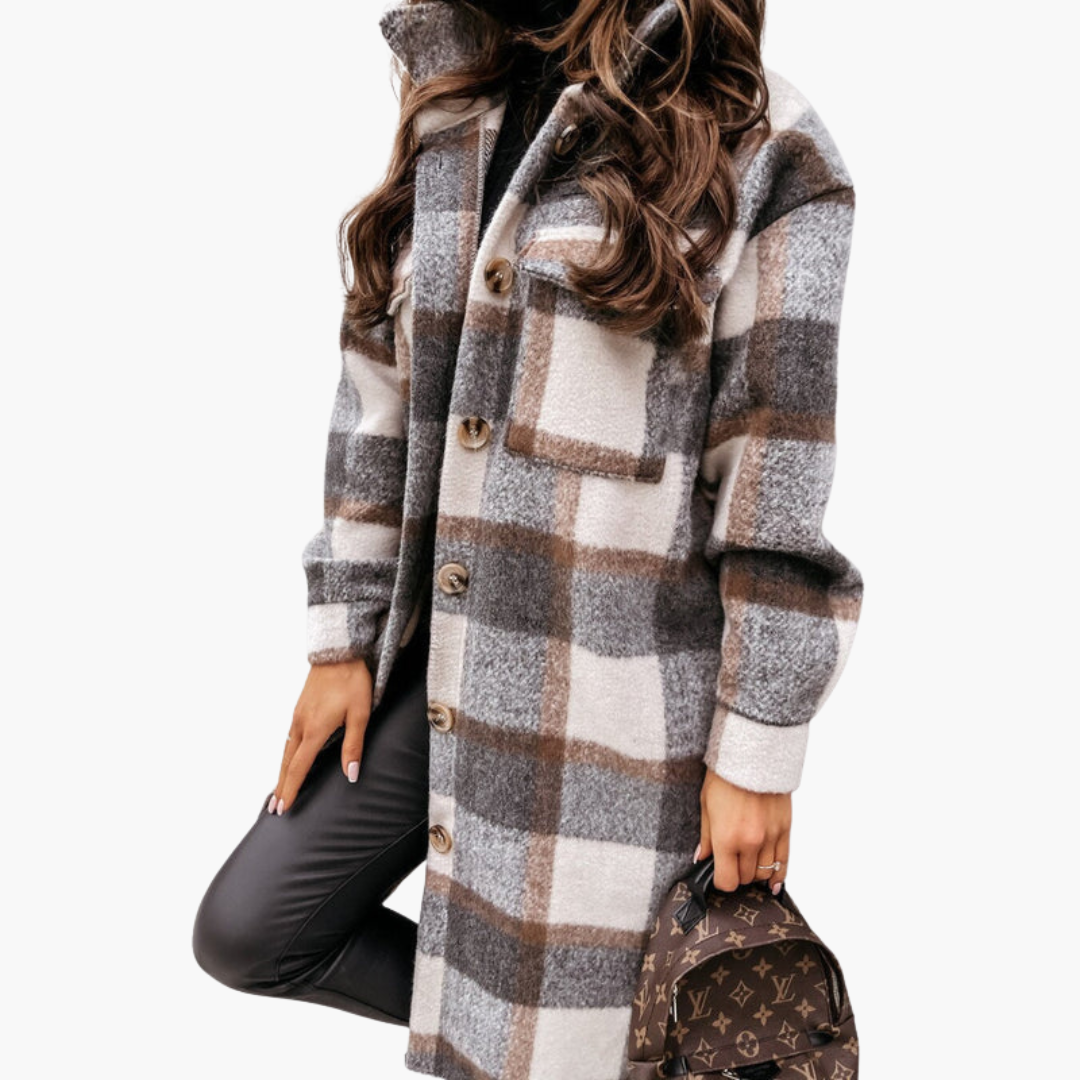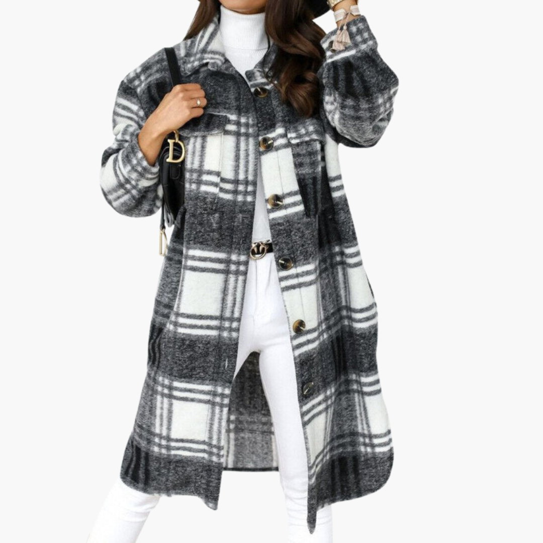 Tá gearradh fada ag an gcóta mná seo le dúnadh iomlán cnaipe agus coilear clasaiceach. Taispeánann an dromchla patrún plaide fuaite ar an gcorp agus ar na muinchillí. Tá dhá phuinn cliathánach le flapaí chomh maith le dhá phuinn taobh suite ar an tosaigh. Leanann na muinchillí fada cruth díreach agus scíthe.