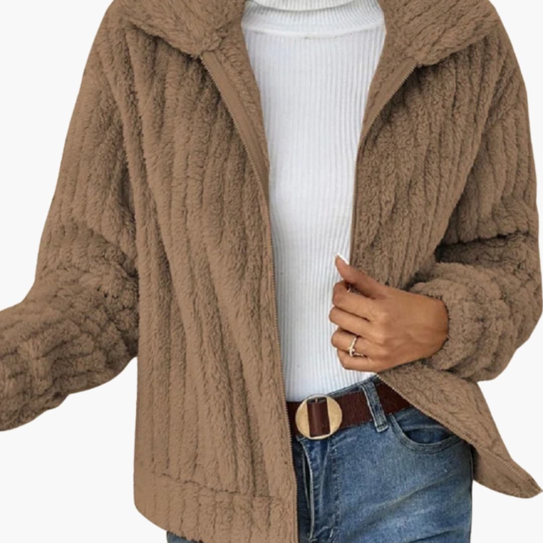 Tá coiléar ard, dúntóir zip tosaigh, agus muinchillí fada le gearradh díreach ag an seacaid mban seo. Tugann a dromchla uigeachtach cuma struchtúrtha agus chothrom di. Críochnaíonn an imeall díreach stíl shimplí agus chothrom, oiriúnach do laethanta fuaire.