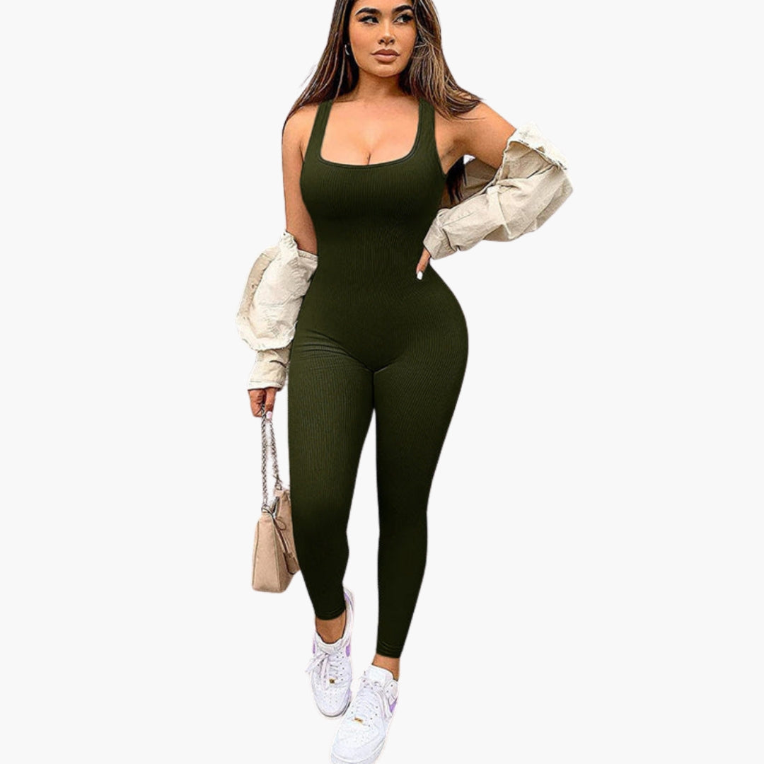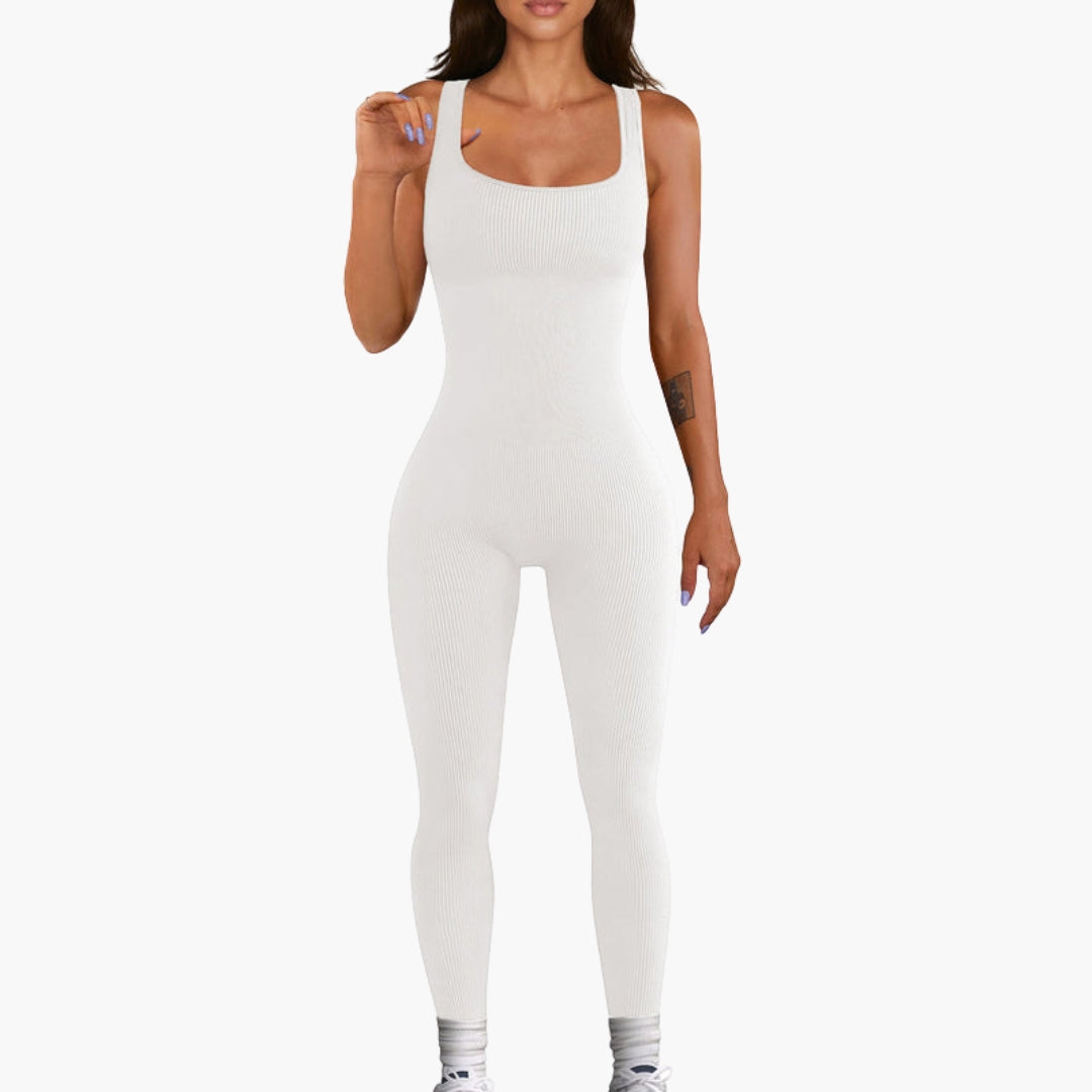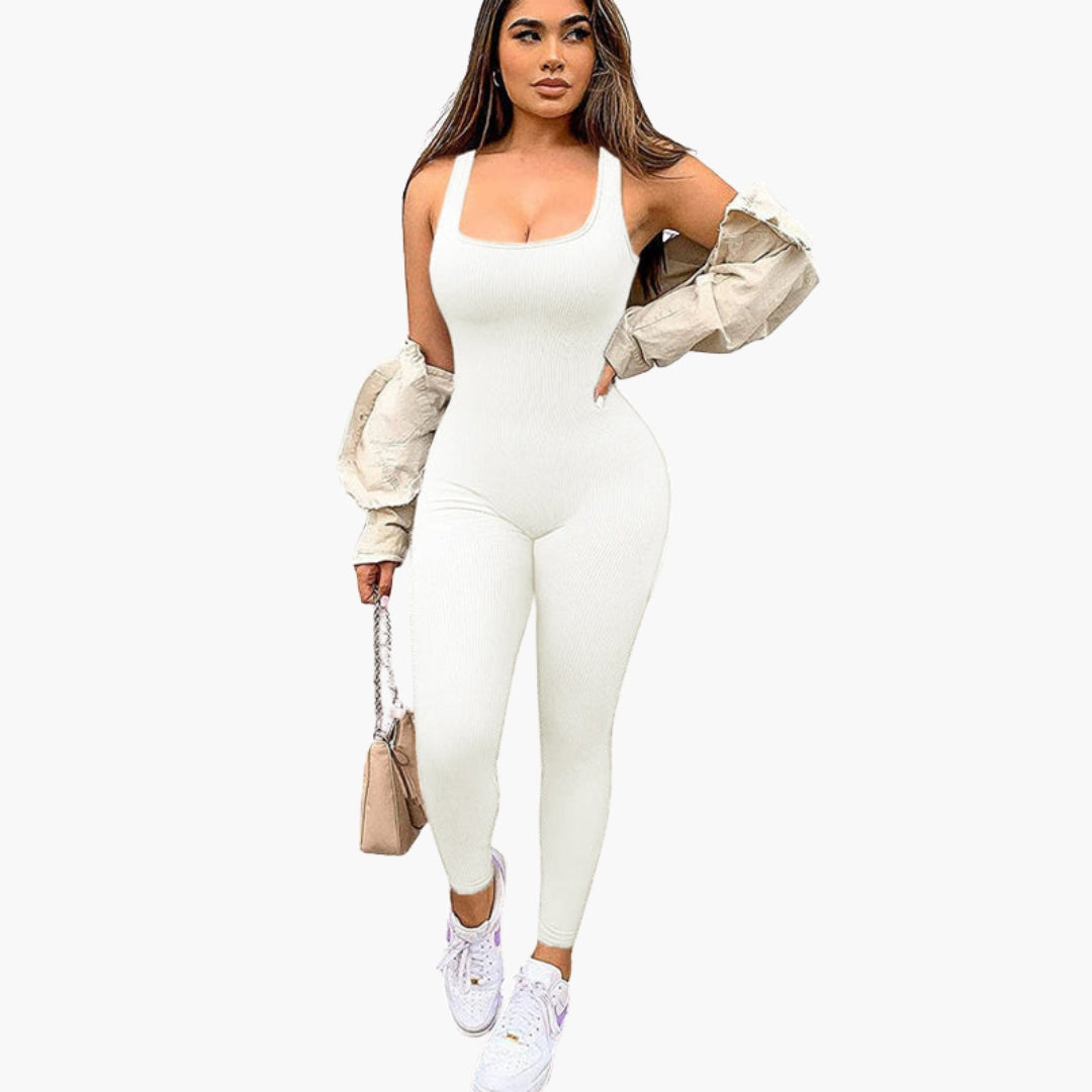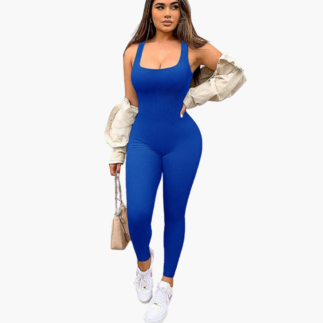 Tá muineál cearnach agus dearadh sleamhnáin ag an ngeansaí do mhná seo. Tá an barr gan mhuinchille ceangailte le cromán ceangailte. Sroicheann na cosa fada síos go dtí na rúitíní. Taispeánann an dromchla uigeacht ribithe ingearach leanúnach. Tá an gúna aon phíosa seo ag teacht go dlúth ar an gcorp le líne ghlan.