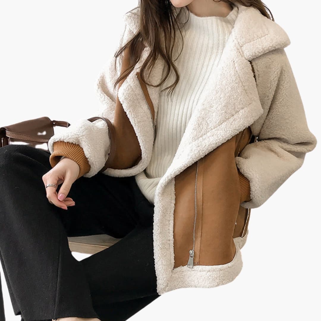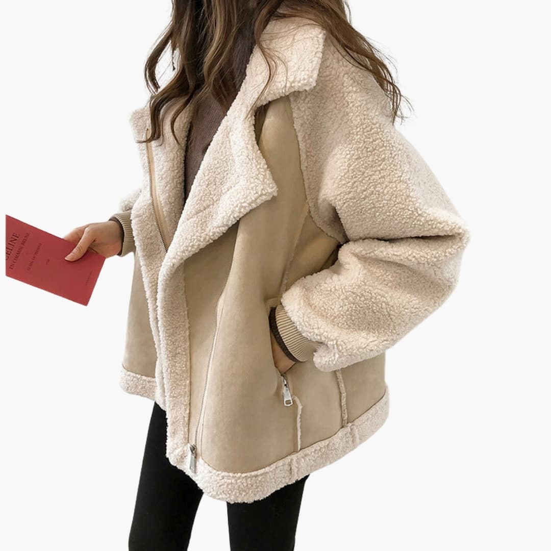 Cóta plush stíl teddy do mhná os cionn mhéide le coiléar leathan agus dúnadh zip lánfhad.