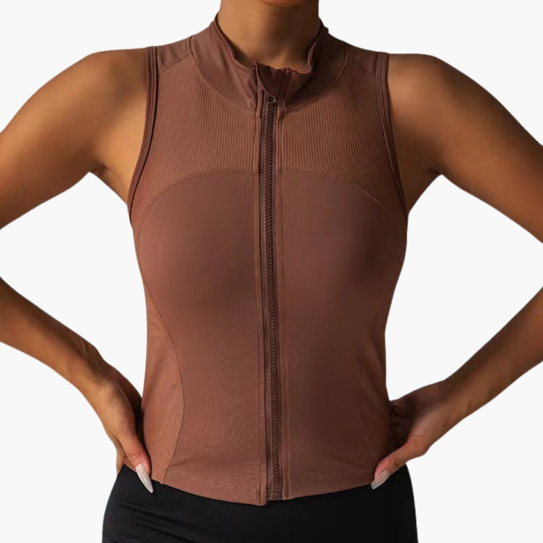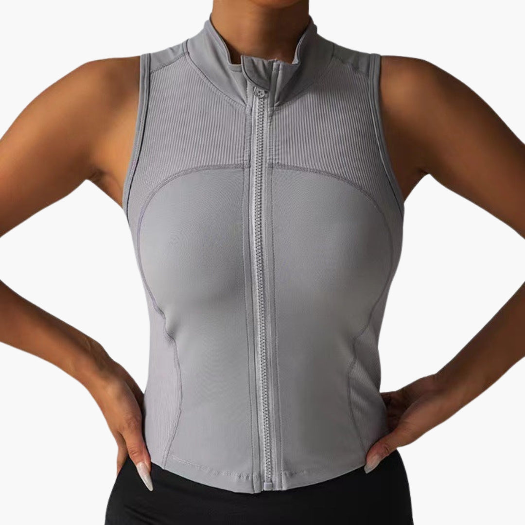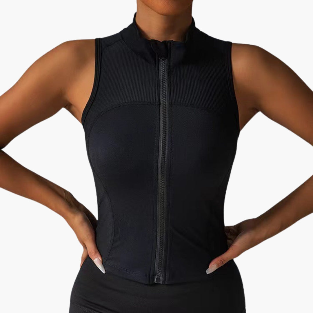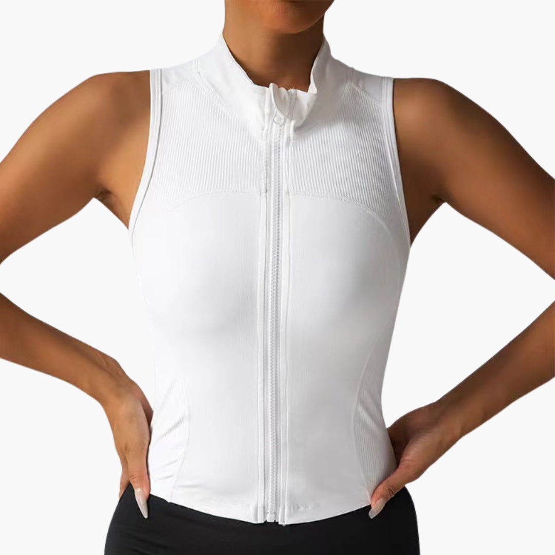 Tá dearadh gan mhuinchillí ag an top spóirt do mhná seo le coiléar ard agus dúnadh zip lánfhad ar an tosaigh. Tá uigeacht ribíneach ar an limistéar uachtarach den chliabhán, agus tá an chuid íochtarach daingean. Tá cruth ceangailte ag an múnla seo gan phócaí agus críochnaíonn sé ag an mhuineál le imeall díreach.