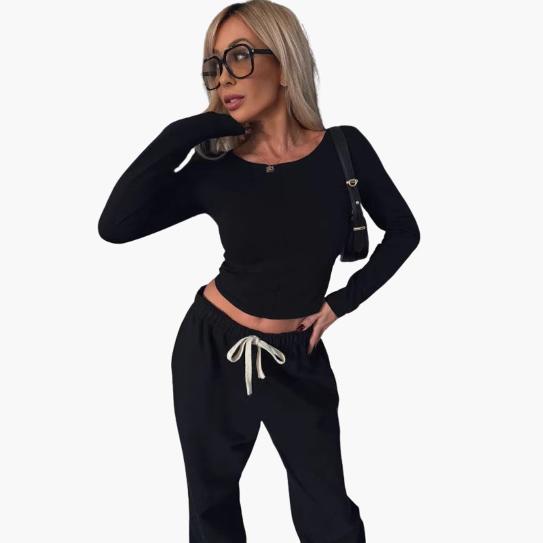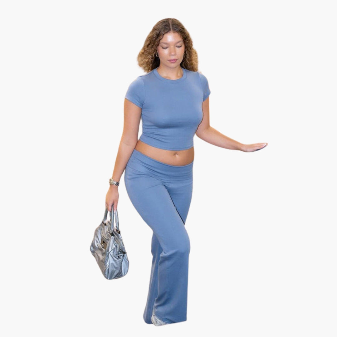 Dvodijelni sportski ženski komplet s kratkim topom i širokim hlačama.