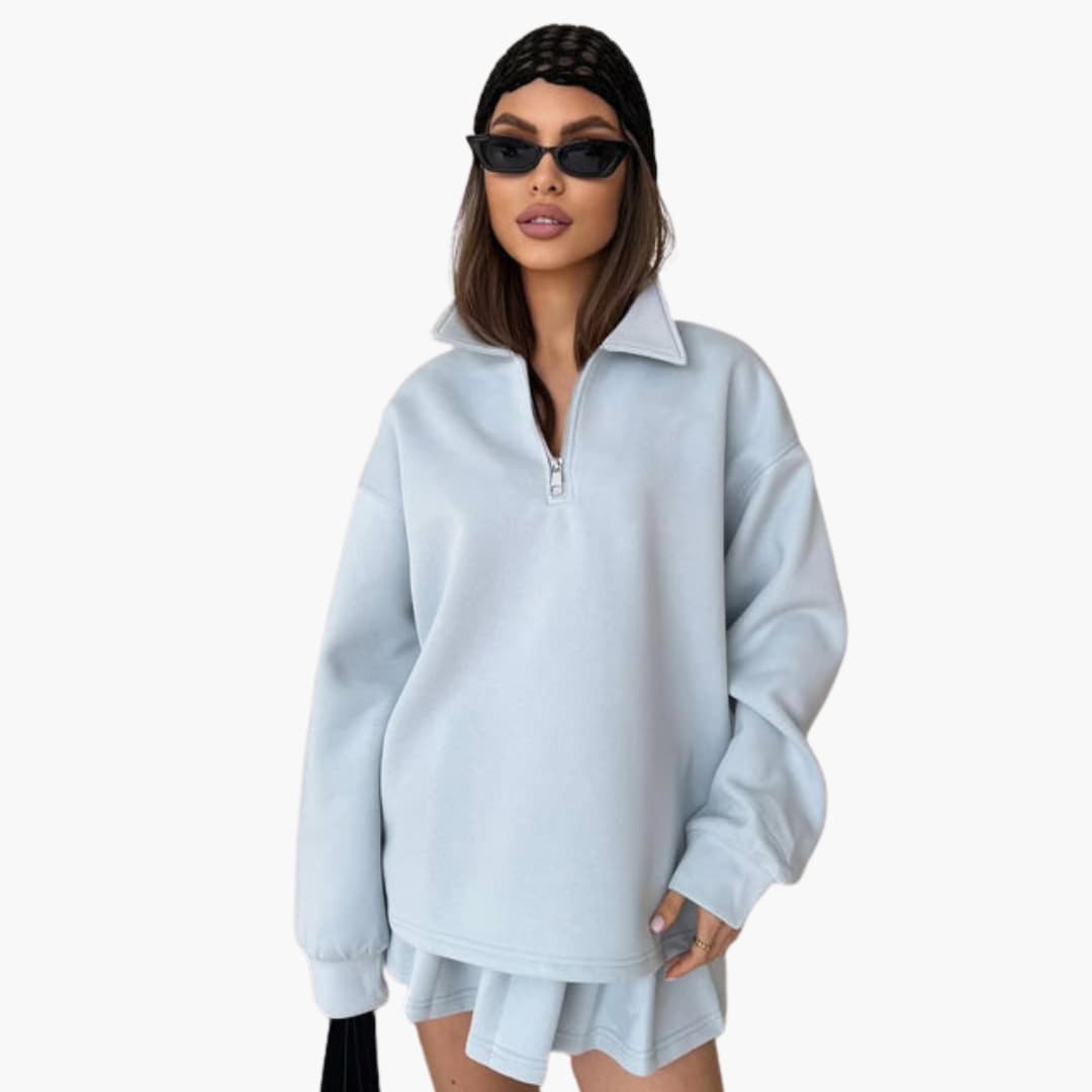 Ovaj ženski komplet sastoji se od džempera s patentnim zatvaračem na ovratniku, dugim rukavima i ravnim rubom. Uključeni bezrukavi unutarnji top dizajniran je za nošenje ispod džempera. Oba dijela su jednostavna za oblačenje i imaju jednoličnu i ujednačenu površinu, bez vidljivih džepova ili dodatnih elemenata za zatvaranje.