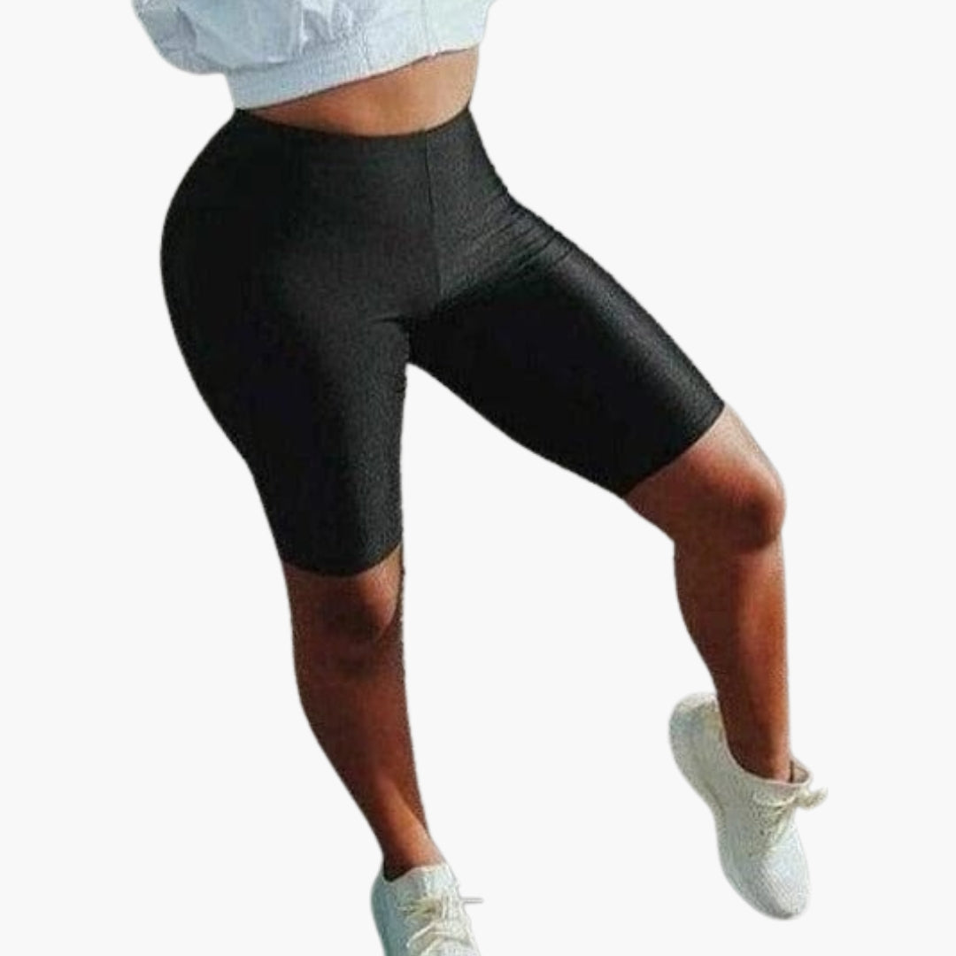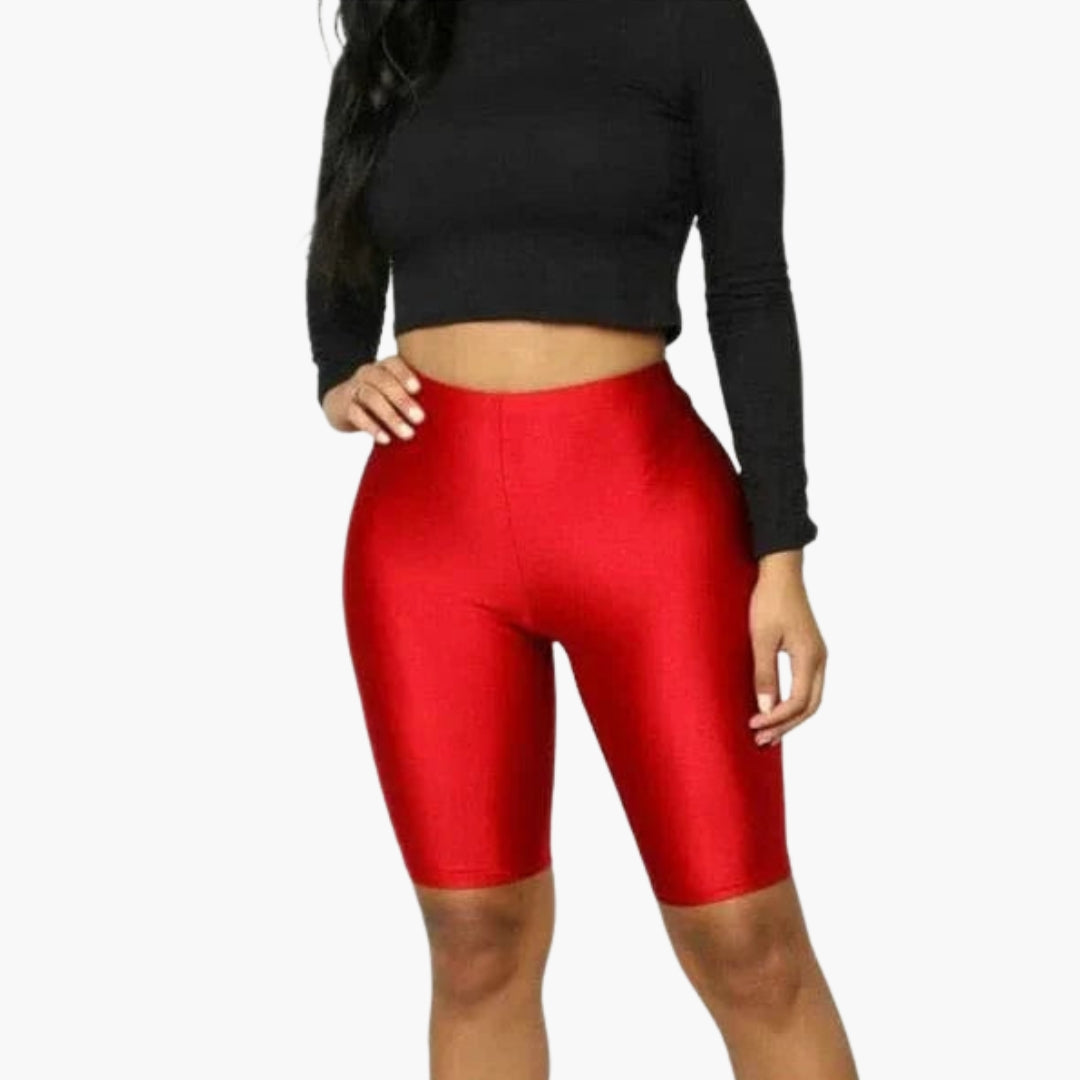 Ez a női sportnadrág magas derekú kialakítással és felhúzható stílussal rendelkezik. A modell testhez simuló, térdig érő lábakat és egyenes szegélyt mutat. A felület fényes megjelenést és egységes textúrát kínál. Ezek a rövidnadrágok alkalmasak ismételt viselésre és gépben moshatók.