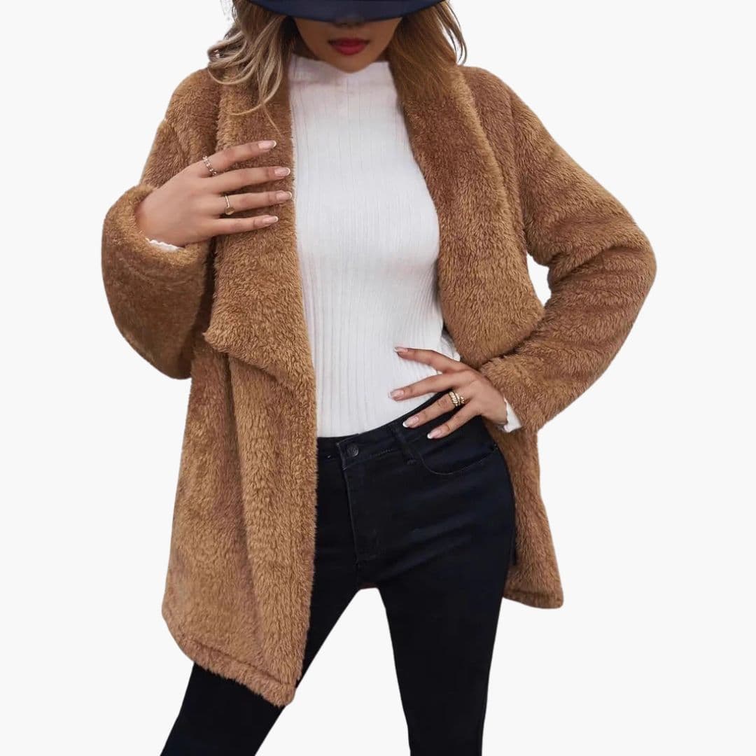 Nyitott női kabát texturált, bolyhos felülettel.