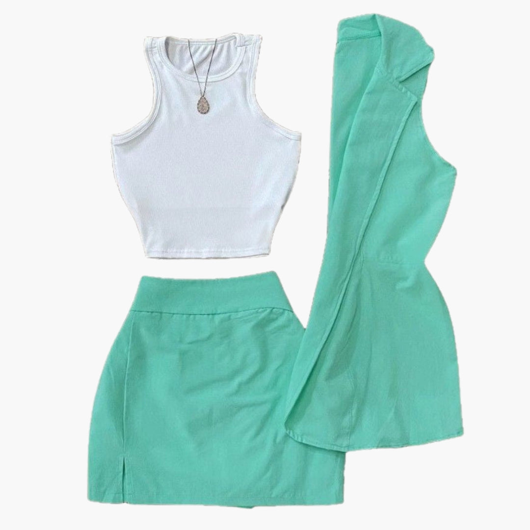 A rövid felső kerek nyakkivágással, széles pántokkal, ujjatlan szabással, bordázott felülettel és egyenes szegéllyel rendelkezik. A rövid szoknya közép magas derékkal, húzós záródással, oldalsó hasítékkal és egyenes szabással, egyszínű megjelenéssel bír. A szett két különálló darabot tartalmaz, amelyeket tetszés szerint kombinálhatsz.