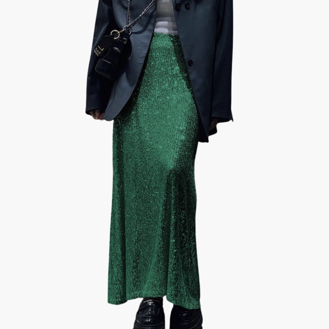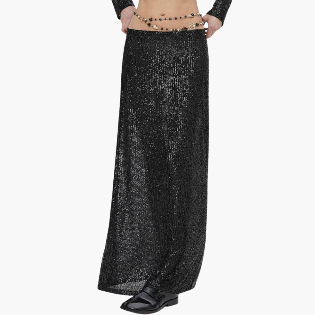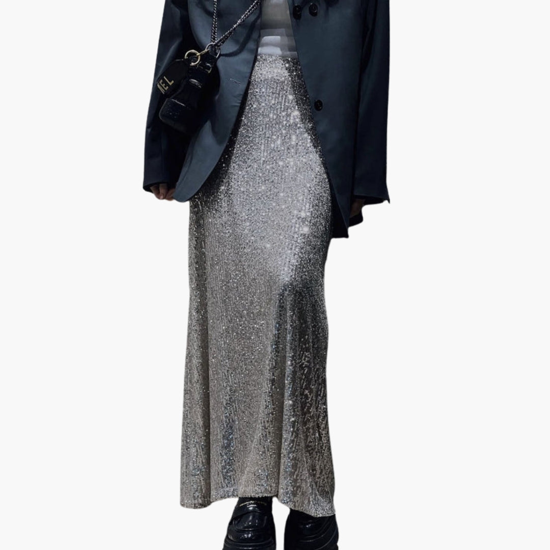 Questa gonna lunga da donna presenta una vita alta con finitura elastica e si infila senza alcuna chiusura visibile. Il taglio avvolge vita e fianchi prima di scendere fino al pavimento. La superficie è decorata con glitter, creando un effetto visivo sorprendente per occasioni speciali o outfit da festa.